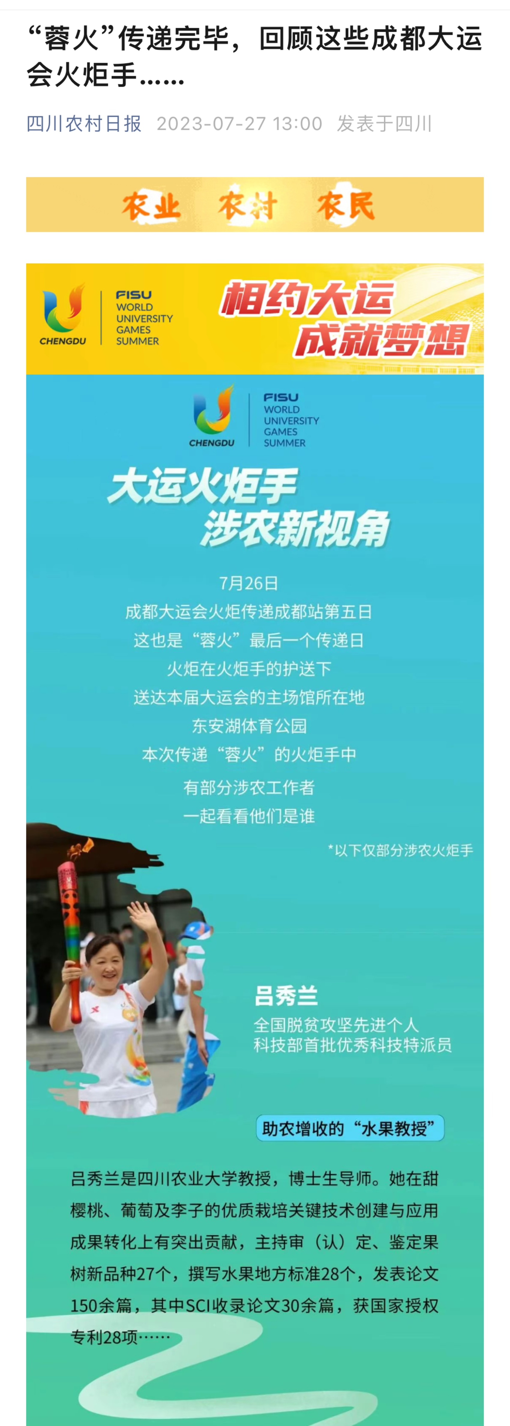 在这场万众瞩目的体育盛会中,川农报把聚光灯对准了本次火炬手中的部分涉农工作者,有助农增收的“水果教授”吕秀兰、有90后种田“CEO”王伶俐、有担任凉山州昭觉县三岔河镇三河村第一书记的李凯……让更多人看到了他们在蜀乡大地上拼搏实干、克难奋进的青春之姿。
