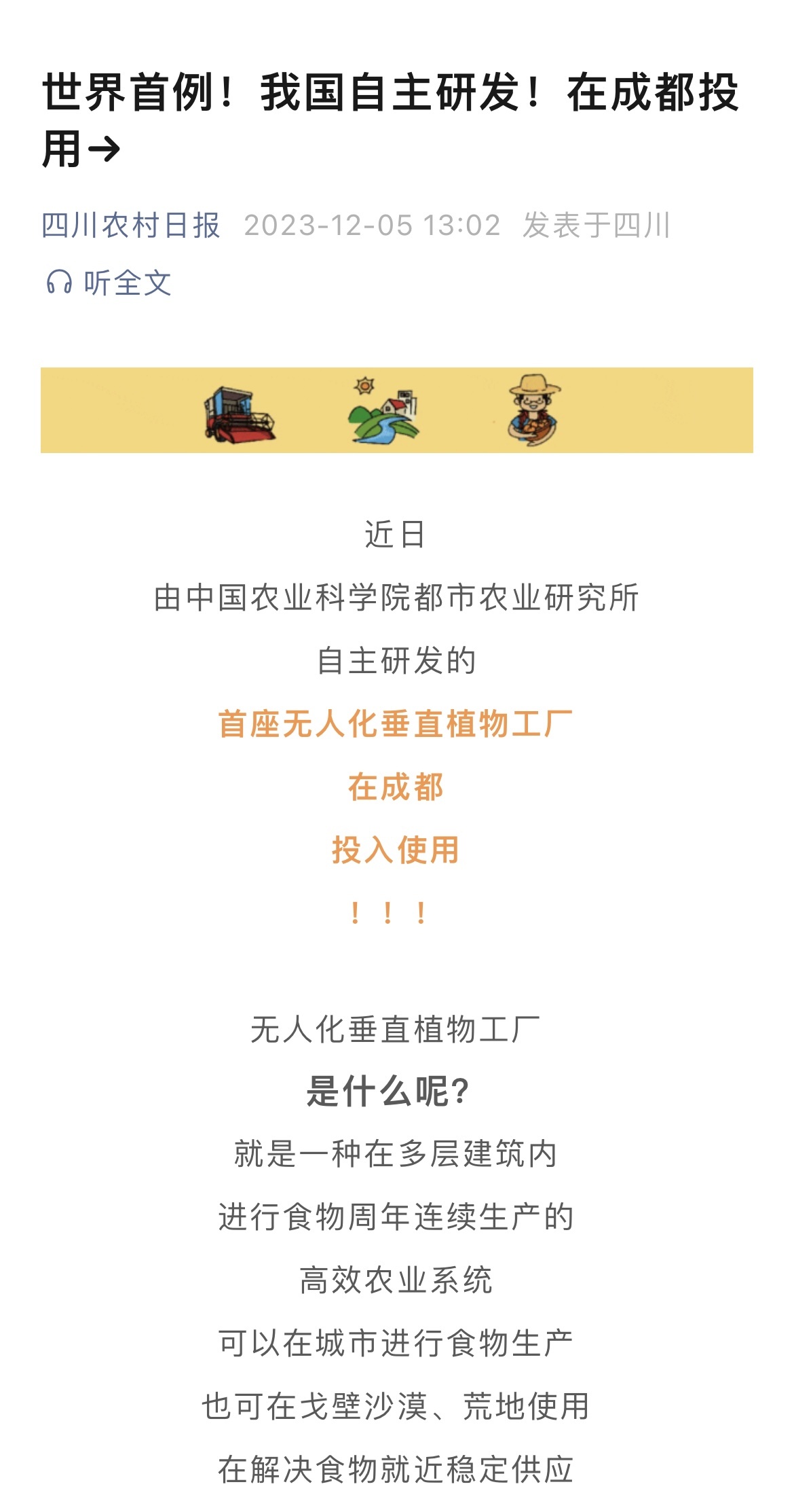 垂直农业技术是设施农业的高级发展阶段,是世界农业前沿科技探索的重要领域。2023年,由中国农业科学院都市农业研究所自主研发的首座无人化垂直植物工厂在四川成都投入使用。