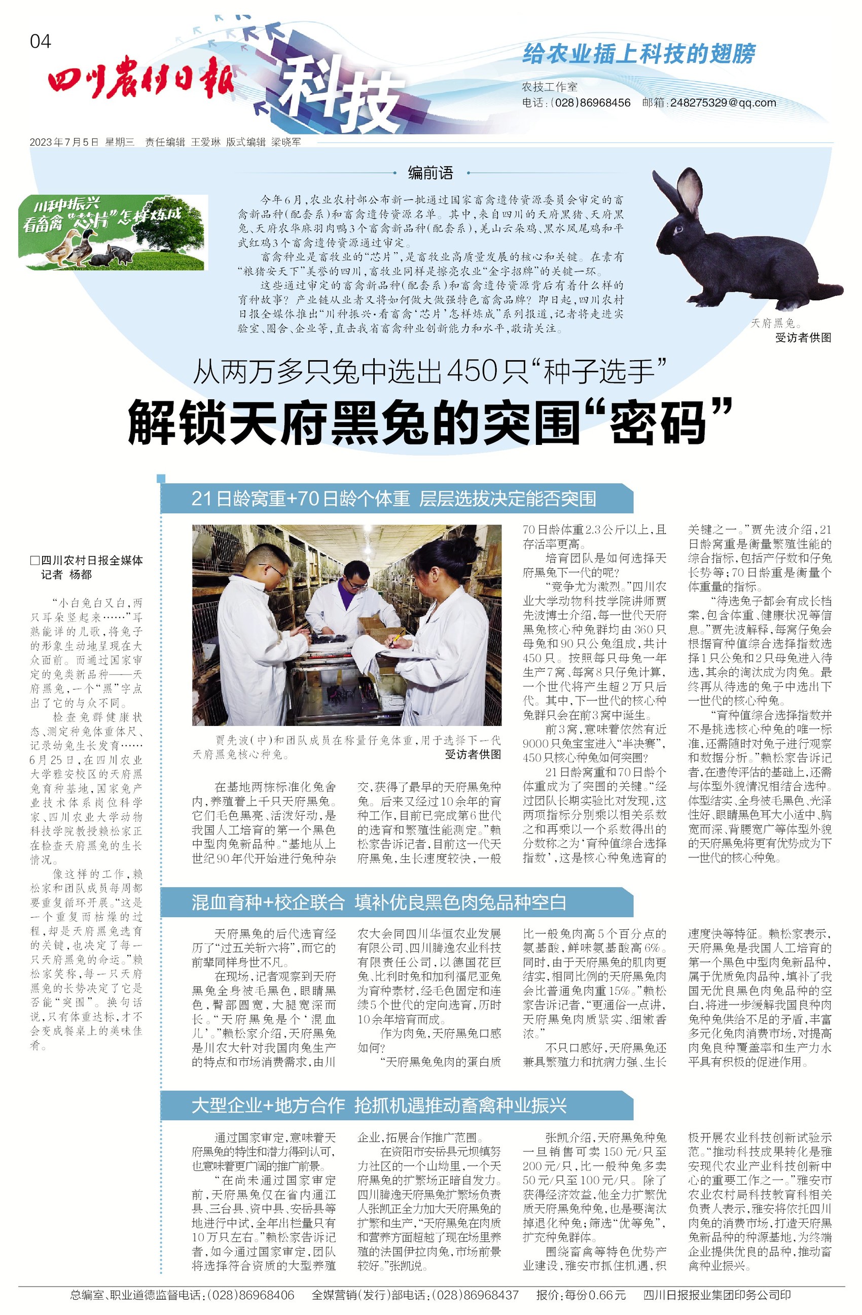 通过国家审定,这不仅代表着天府黑兔繁殖力强、生长速度快、肌肉品质优等特性和潜力得到认可,还意味着更大的推广发展前景,有力推动了畜禽种业振兴。