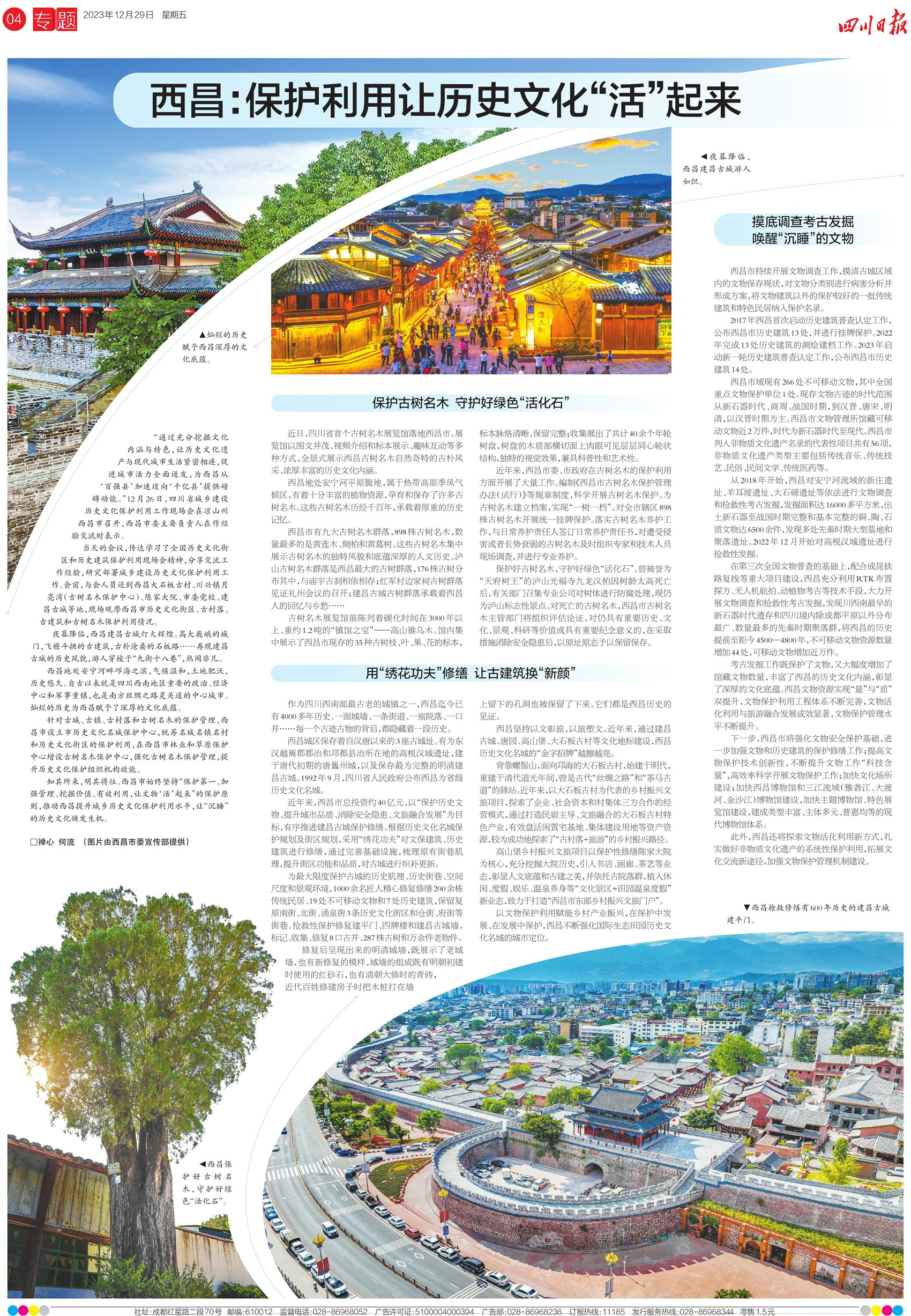 12月29日,四川日报刊发文章《西昌:保护利用让历史文化“活”起来》,聚焦近年来西昌针对古城、古镇、古村落和古树名木的保护管理,坚持“保护第一、加强管理、挖掘价值、有效利用,让文物‘活’起来”的保护原则,推动西昌提升城乡历史文化保护利用水平,让“沉睡”的历史文化焕发生机。西昌自古以来就是四川西南地区重要的政治、经济中心和军事重镇,也是南方丝绸之路灵关道的中心城市,灿烂的历史为西昌赋予了深厚的文化底蕴。此前的12月26日,四川省城乡建设历史文化保护利用工作现场会在西昌市召开,凉山州委常委、西昌市委书记马辉在会上作经验交流,他表示:“通过充分挖掘文化内涵与特色,让历史文化遗产与现代城市生活紧密相连,促进城市活力全面迸发,为西昌从‘百强县’加速迈向‘千亿县’提供磅礴动能。”