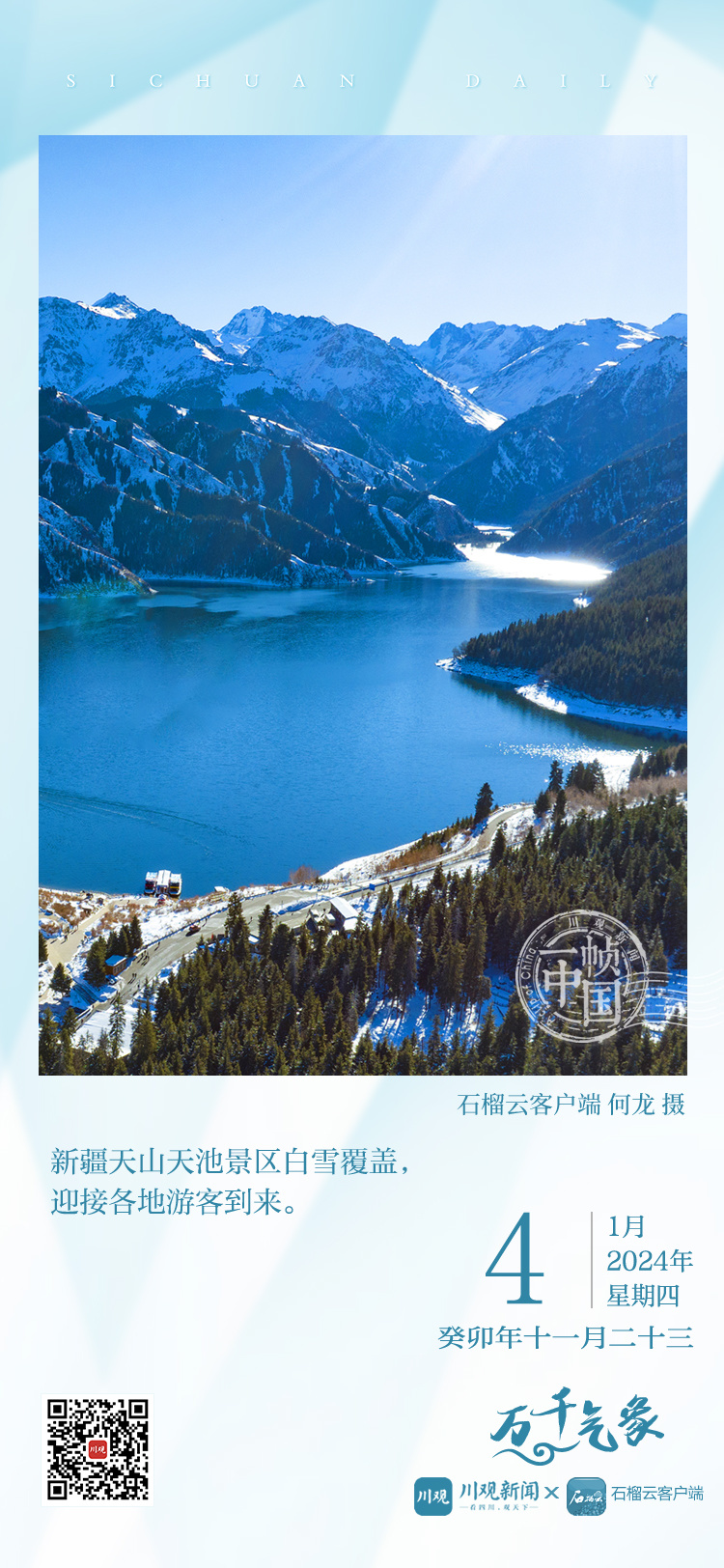 今天的《一帧中国》,川观新闻联合新疆日报石榴云客户端,带您图览美丽的天山天池景区,领略“雪映云杉”的浪漫。冬日的新疆天山天池,清澈如镜,层峦叠嶂、云雾缭绕,宛如仙境。