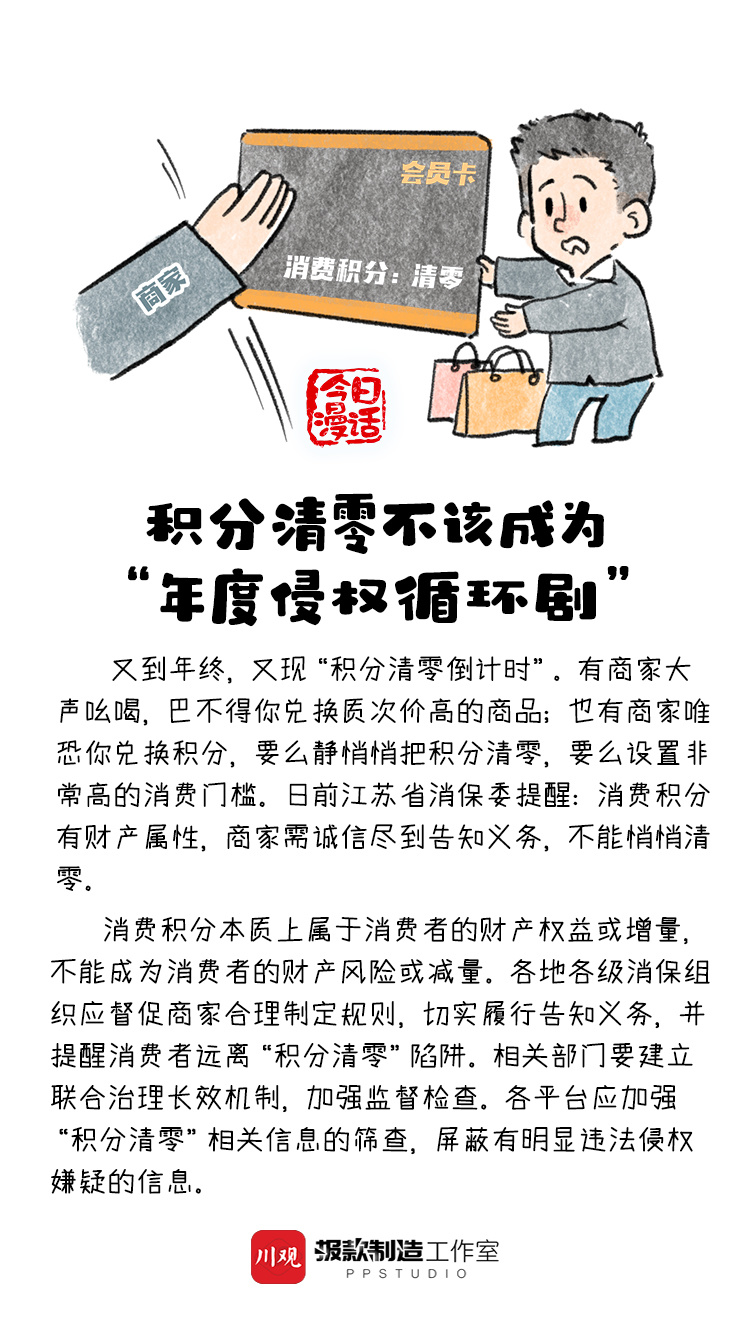 又到年终,又现“积分清零倒计时”。消费积分本质上属于消费者的财产权益或增量,积分清零不该成为“年度侵权循环剧”。对此,你怎么看?