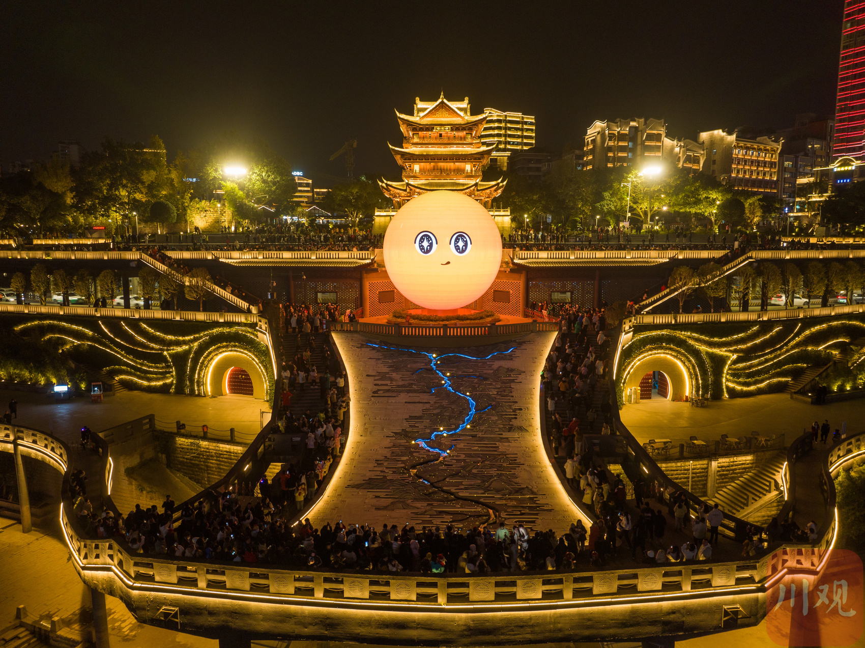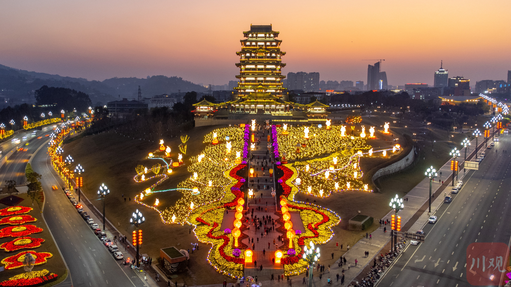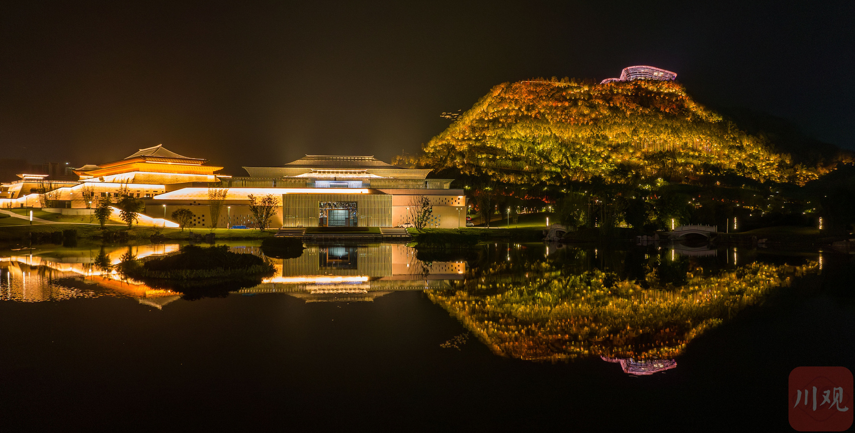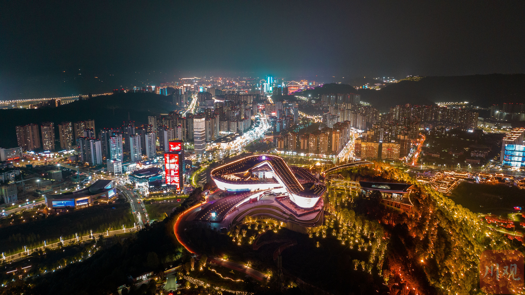 12月6日,灯光下的龙头山和宜宾市竹文化博物馆
