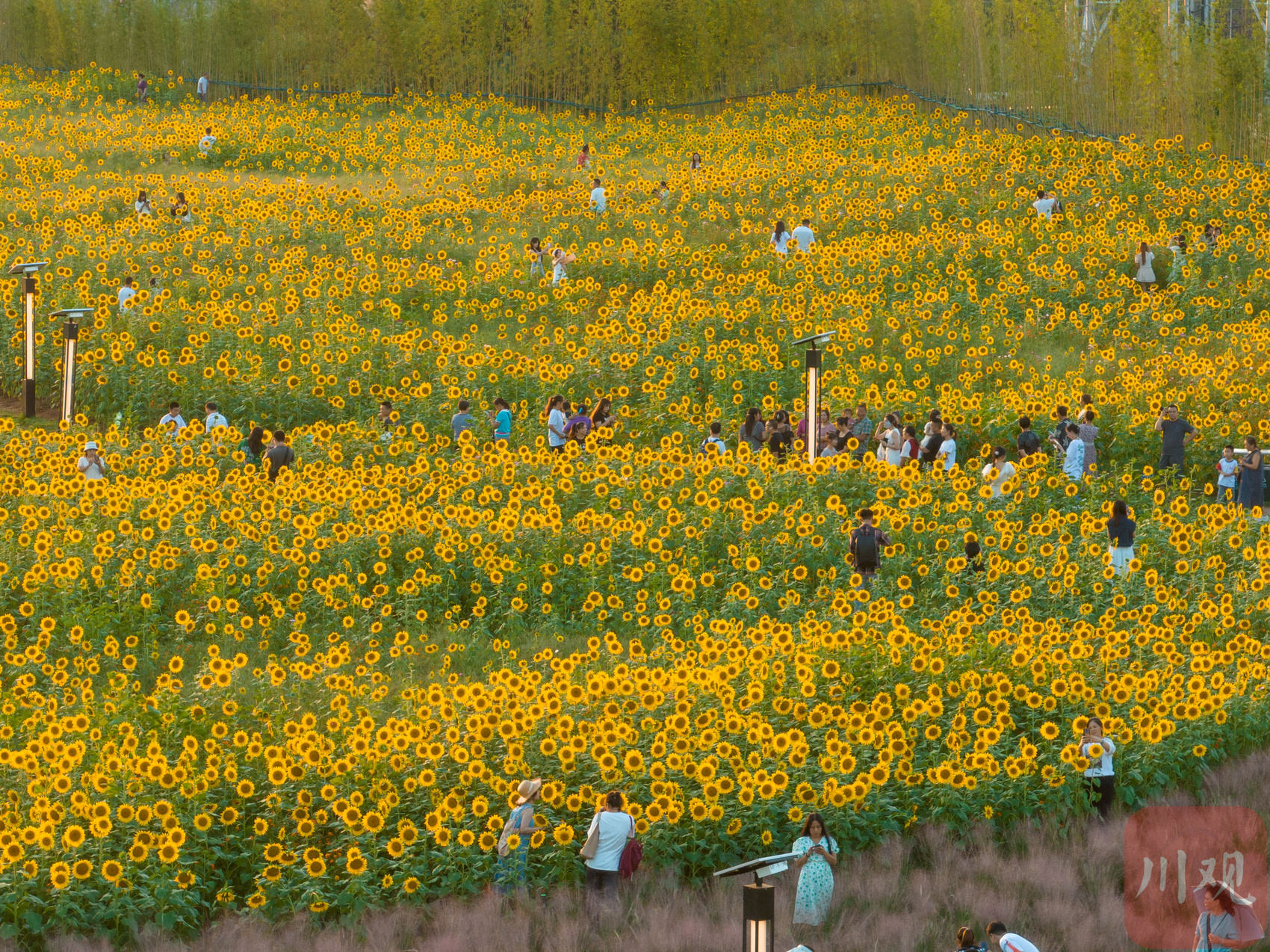 9月13日,游客在宜宾市翠屏区上江北滨江路向日葵花海中拍照打卡