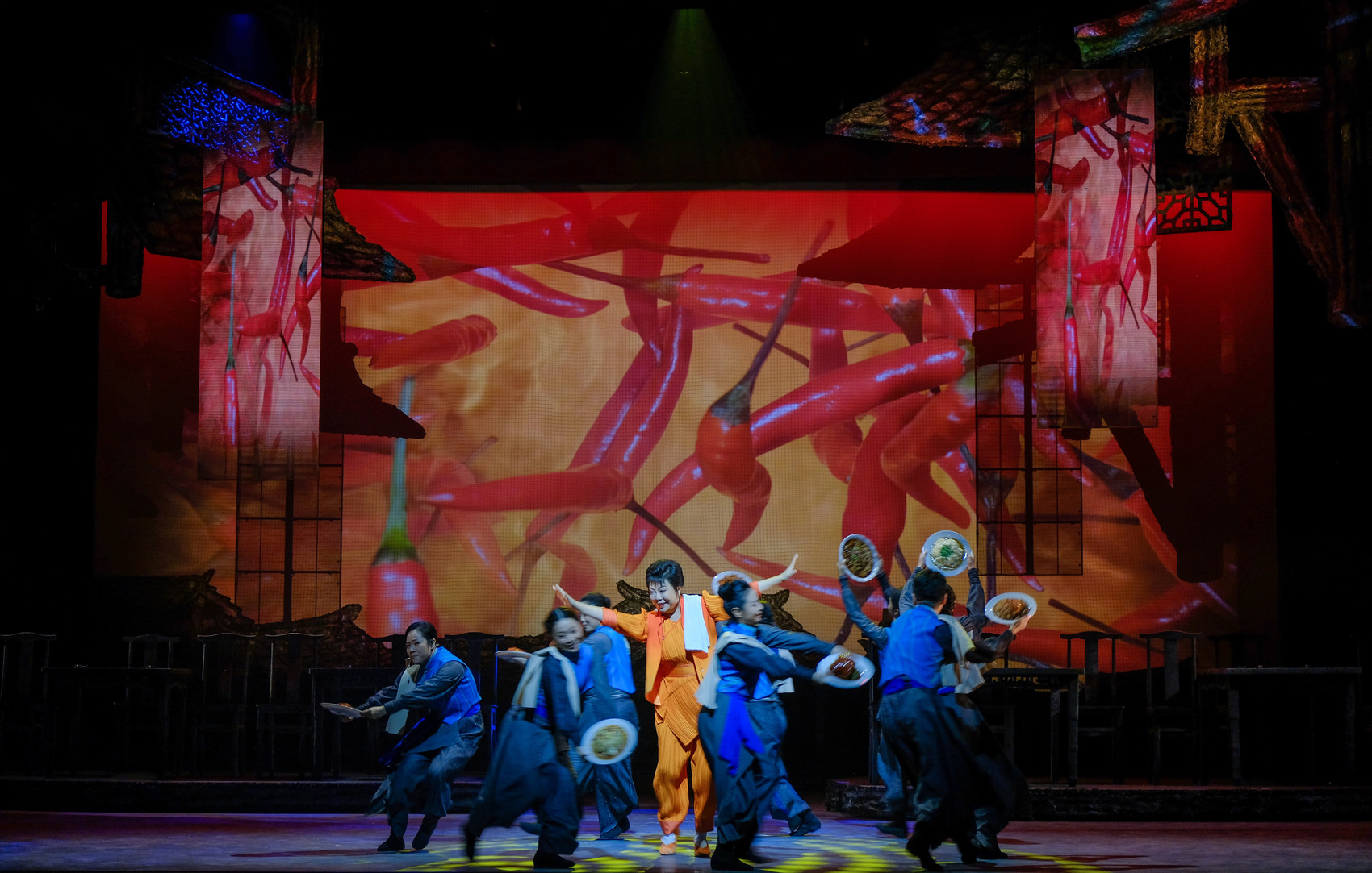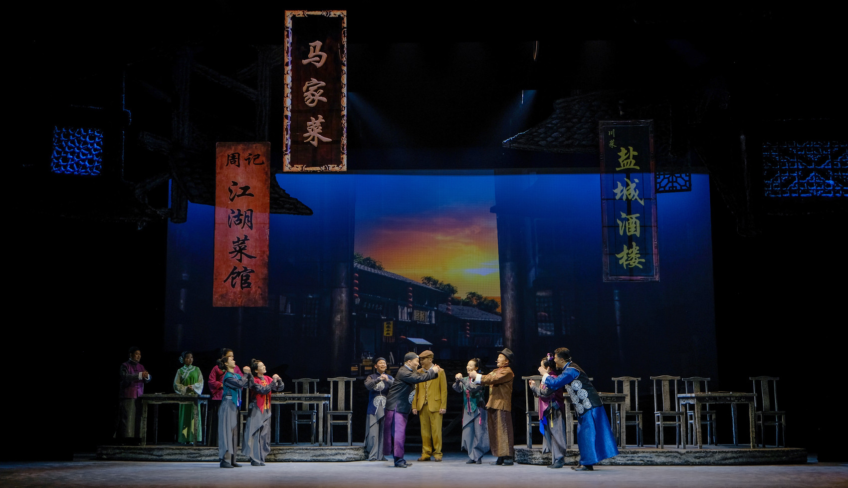 首演现场,手绘样式的屋檐及桌椅,搭配模块式的舞台设置,在行云流水般的移动中拼凑成不同的舞台场景,展现出极富地方特色和烟火气的四川餐馆风貌。