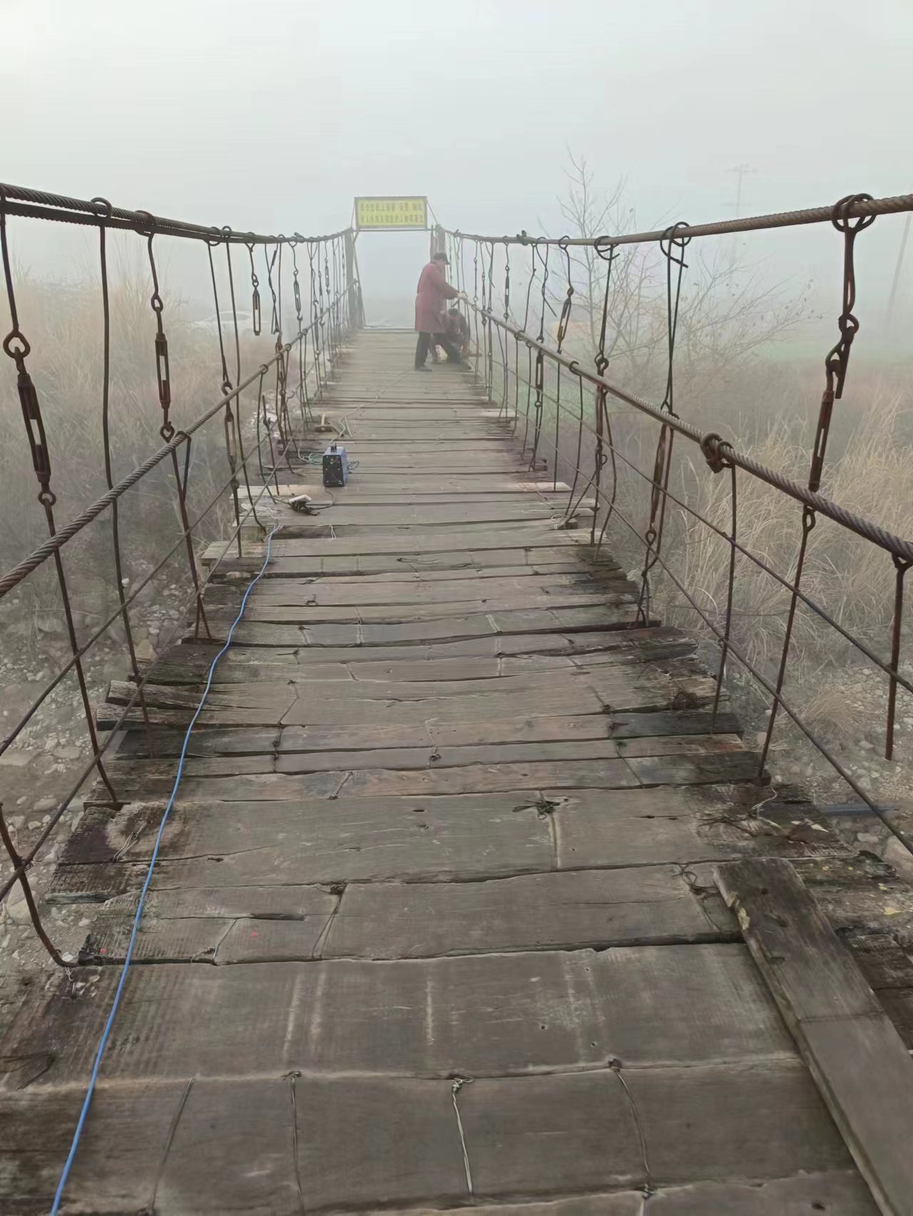 “因为使用频繁,常走自行车、电瓶车,铁索桥不堪重负地歪了,变成危桥。”陈翀说,夏天过河脚下是湍急的河水,冬天过河更惊险,桥面结了霜,一个脚滑,可能就会掉到河里,童叟过河更是心惊胆战。