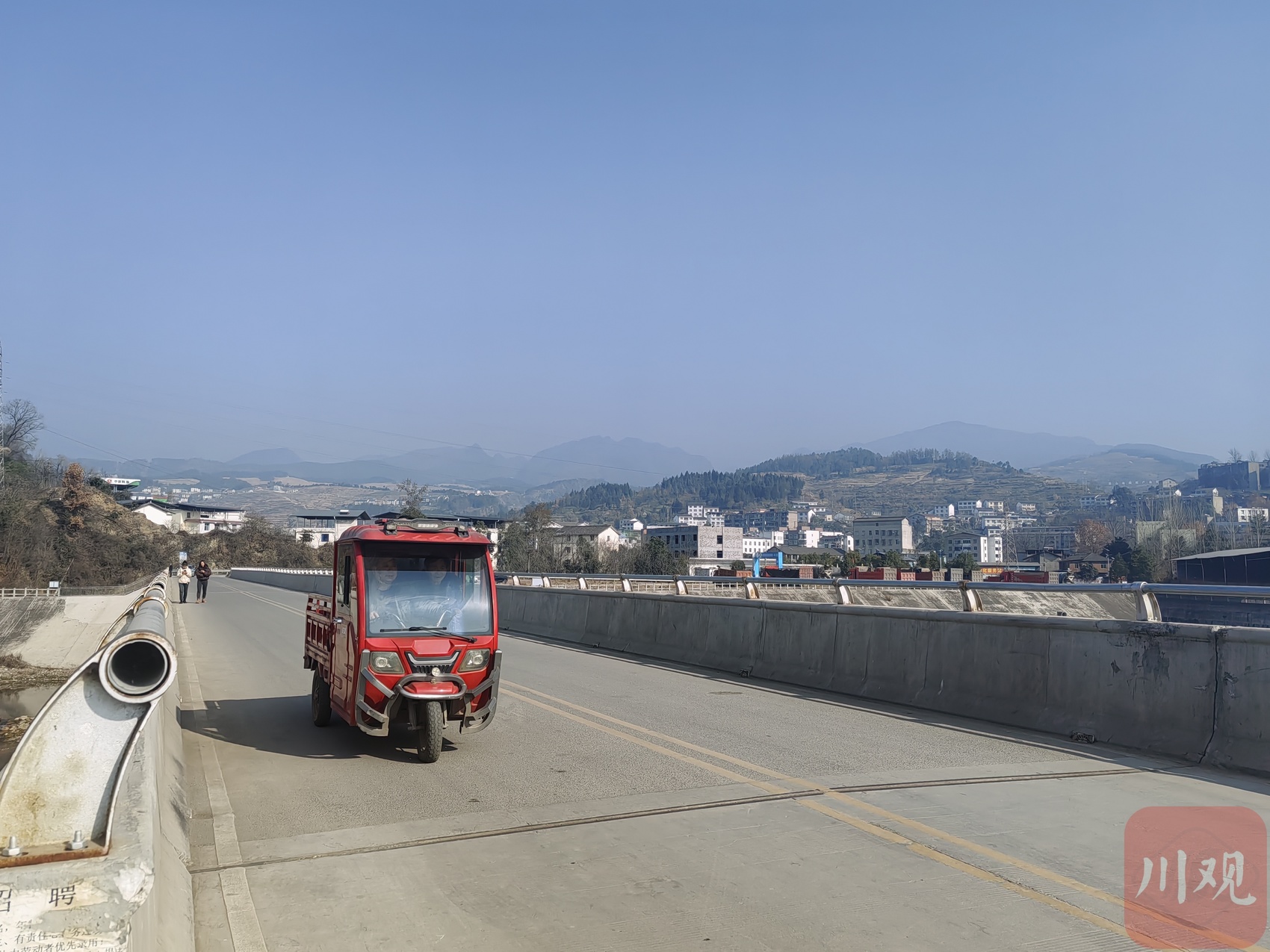 公路桥上,村民驾驶三轮车驶过。