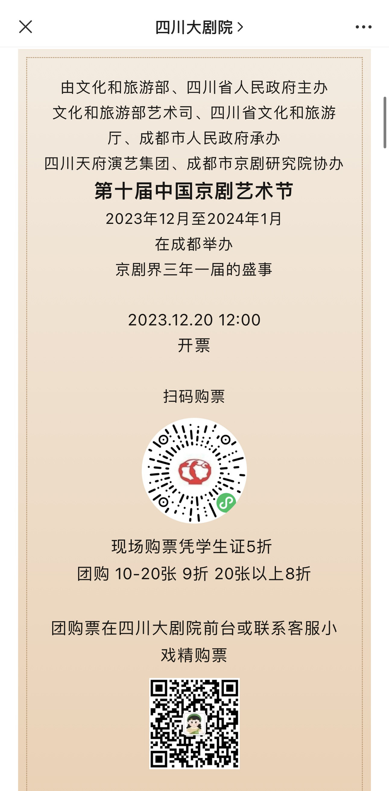 记者了解到,此次京剧艺术节相关活动将持续至2024年1月21日,2024年1月将有《东方大港》《石评梅》《薛涛》等12部京剧剧目上演,均已开票,票价根据座位80元至480元不等,学生群体可享受半价优惠,广大学生戏迷可以关注四川大剧院具体场次和时间,有感兴趣的剧目可到现场凭学生证5折购票。