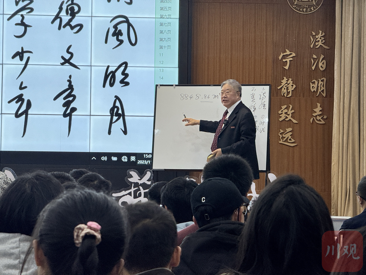 2023年11月25日,四川大学(望江校区)文理图书馆,由四川日报全媒体主办的“天府文艺讲坛”开讲。北京大学中文系教授、博士生导师程郁缀应邀前来授课,题目是“古典诗歌与人文精神”。在授课结尾,程郁缀由唐代诗人孟郊的《游子吟》讲到了关于母亲的话题。“滴水之恩当涌泉相报是中华民族的传统美德,而来自母亲的恩情则是涌泉之恩。滴水之恩、涌泉相报,涌泉之恩、大海相报!”讲到最后,程郁缀昂首振臂、字字铿锵,一如数十年来在北大课堂上的激情飞扬,引来台下听众经久不息的掌声。