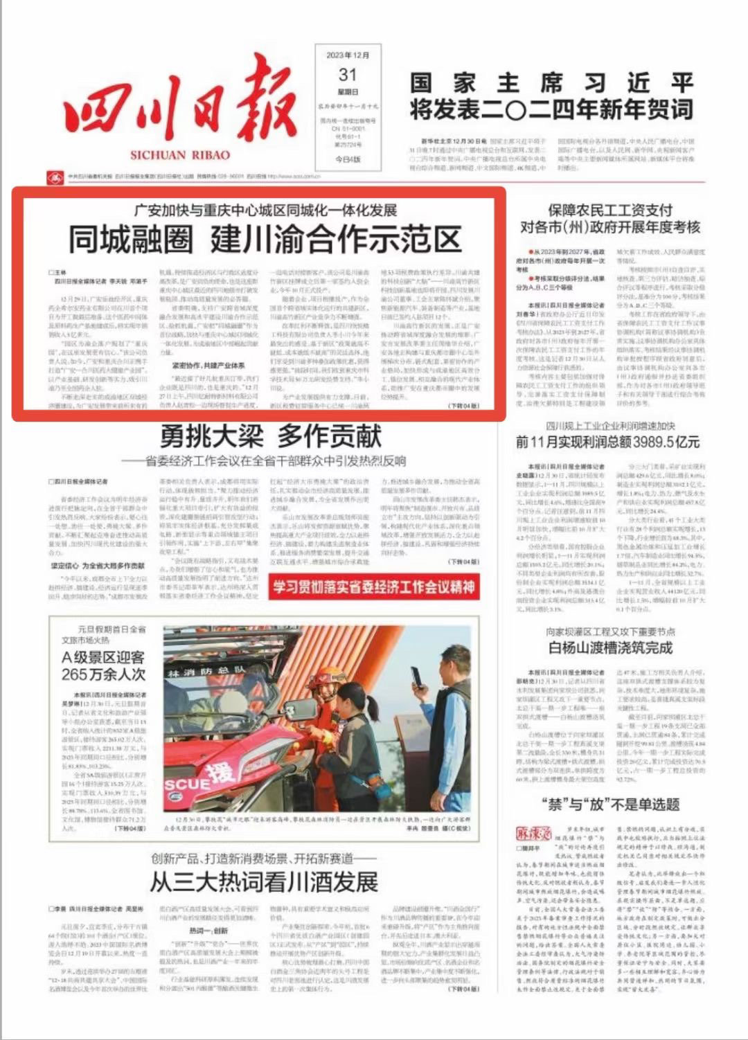 12月31日,《四川日报》头版头条刊发稿件《广安加快与重庆中心城区同城化一体化发展——同城融圈 建川渝合作示范区 》。广安正以改革创新的勇气,在跨省域深度融合发展走深走实中崛起。