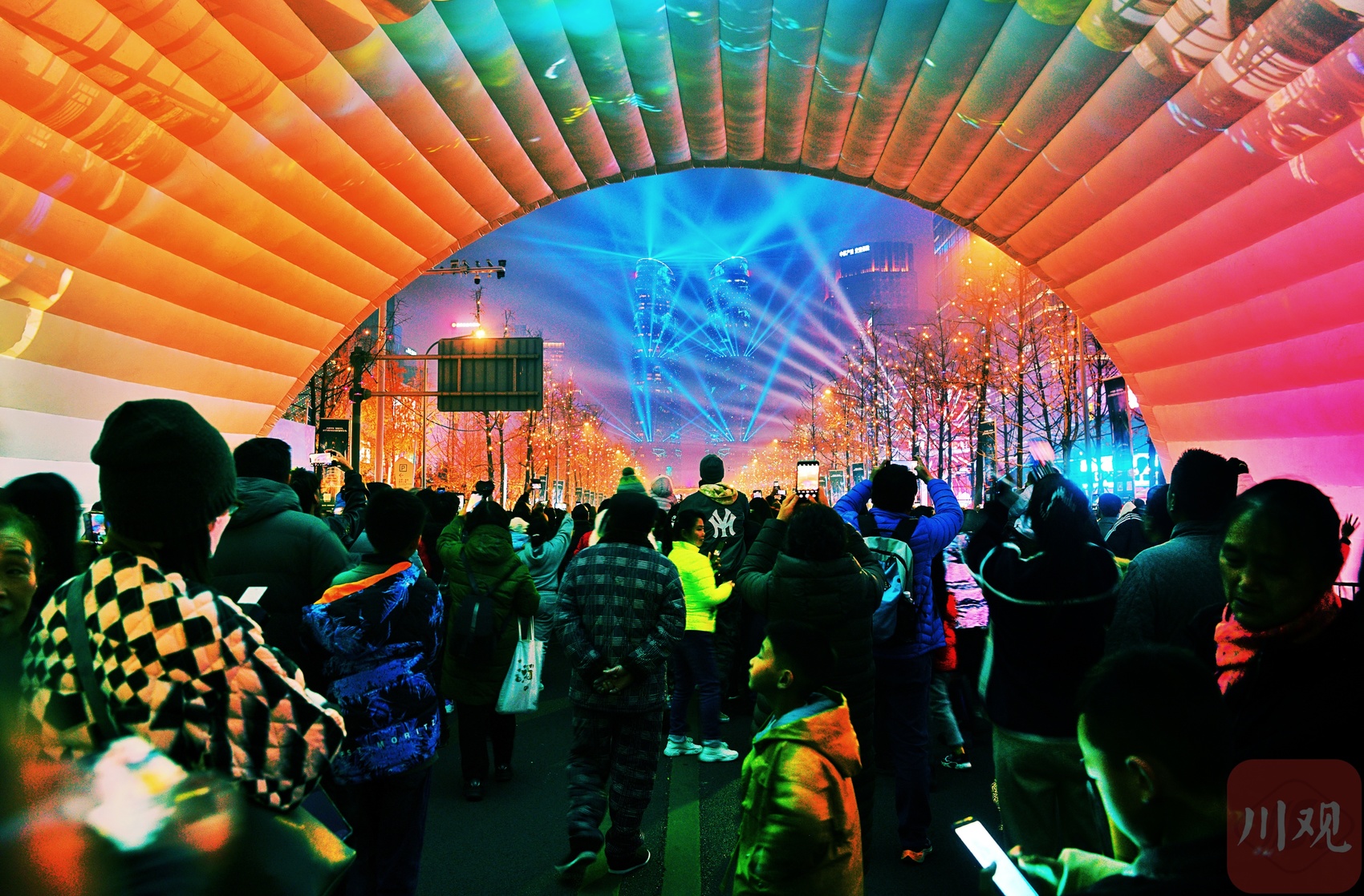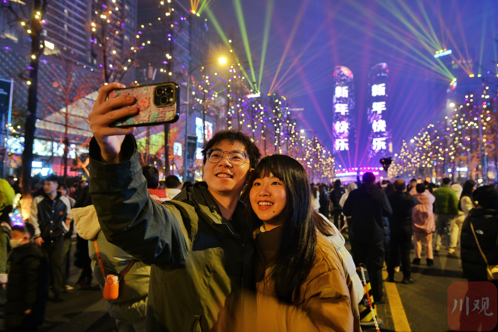 2023年12月31日晚,成都交子大道、双子塔灯光璀璨,市民涌上街头在炫酷节奏中喜迎2024新年的到来。