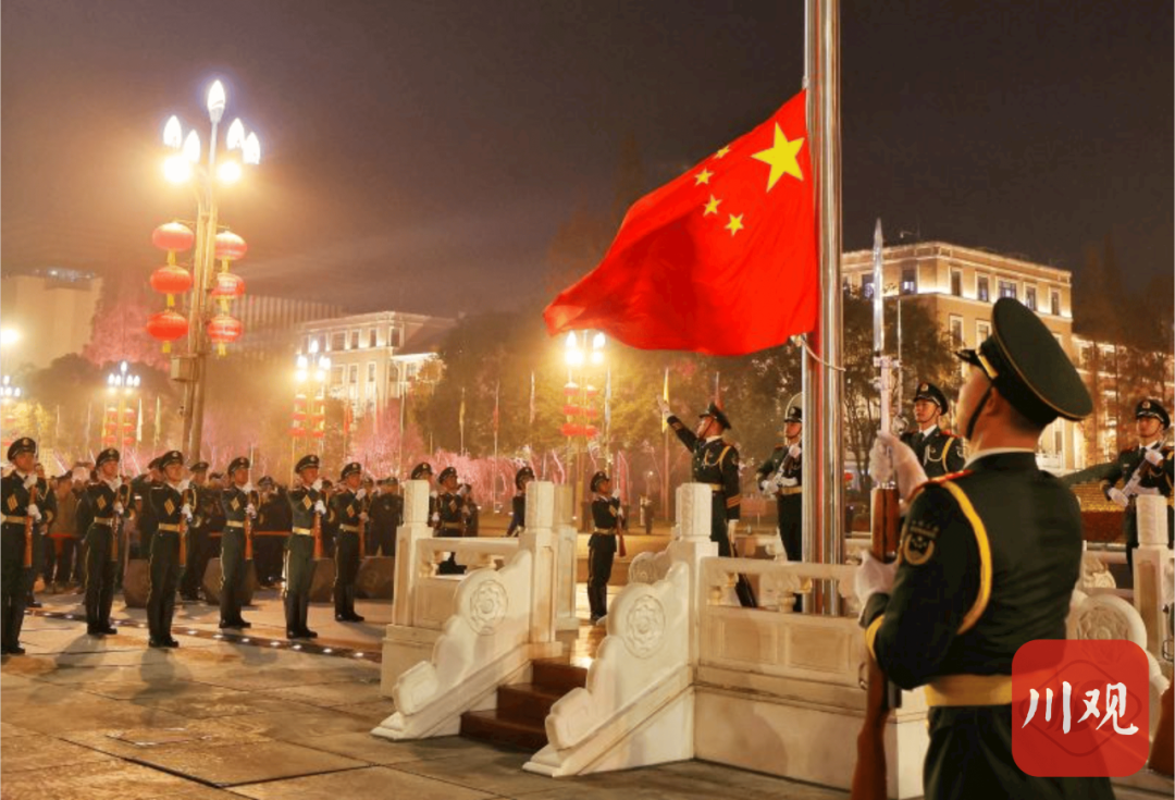 伴随着雄壮的国歌奏响和一声铿锵豪迈的“敬礼”,升旗手将手中的国旗向空中一扬,鲜艳的五星红旗迎着天空,在天府广场上缓缓升起,武警战士行军礼,人们立正行注目礼,少先队员行队礼。