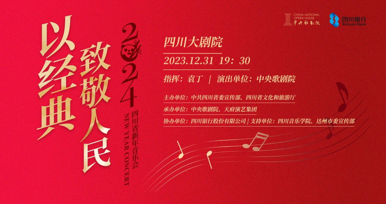 2023年12月31日晚,由中共四川省委宣传部、四川省文化和旅游厅联合主办,中央歌剧院、四川天府演艺集团联合承办,四川银行股份有限公司协办的“以经典致敬人民”2024四川省新年音乐会在四川大剧院举行,通过一台名家汇聚、名段荟萃的音乐晚会,向辛勤耕耘的全省各行各业人民群众致以节日慰问,同时拉开了新年惠民音乐系列活动的序幕。
