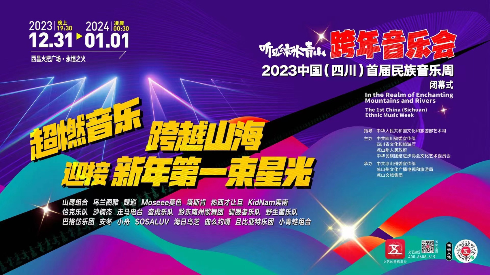 同时,在凉山,“听见绿水青山”2023中国(四川)首届民族音乐周闭幕式暨跨年音乐会在西昌火把广场举行。现场气氛热烈,观众们热情洋溢。来自10个不同民族的20组少数民族音乐人及乐队,包括乌兰图雅、山鹰组合等,用多元的音乐风格,带来了一场长达5个小时的民族音乐表演,带领近万名现场观众迎接充满希望的2024年。