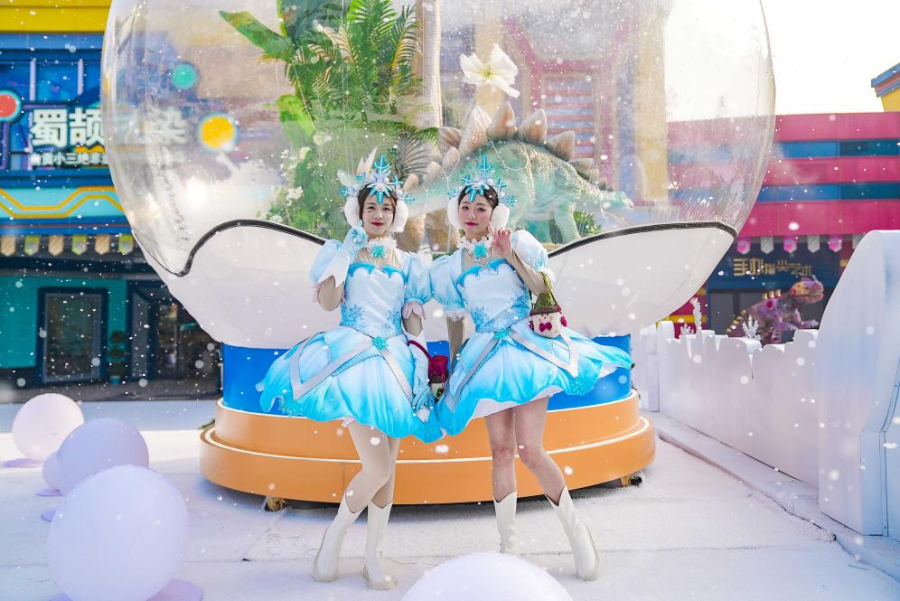 12月31日跨年夜当天,不少游客选择前来自贡方特与亲朋好友一起欢度时光。“飞雪秘境”将恐龙小镇银装素裹,让游客们一入园就开启唯美沉浸式游园体验,并有机会与软萌NPC、熊强三人组甜蜜互动,在镜头前留下一幕幕难忘的冬日回忆。
