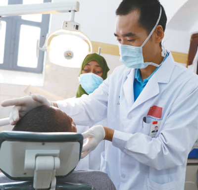 在纳兹莫加医院,口腔科医生盛磊给患者看病。 新华社记者 董江辉摄