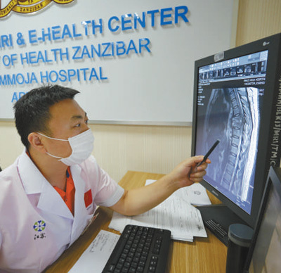在纳兹莫加医院,影像科医生杨维柘查看核磁共振检查结果。 中国援桑给巴尔医疗队供图