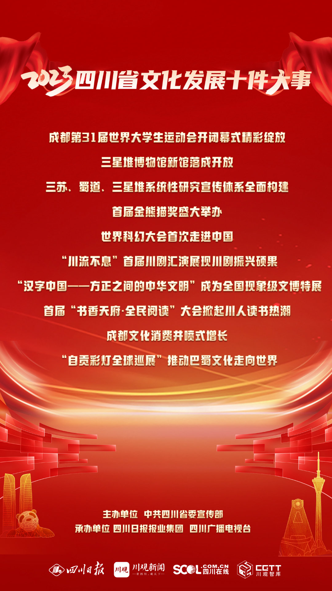 1月2日,由中共四川省委宣传部主办,四川日报报业集团、四川广播电视台联合承办的2023四川省文化发展十件大事评选活动发布仪式在成都举行,经过网络票选和专家评审,2023四川省文化发展十件大事正式发布,来看看哪些文化发展大事最终入选。