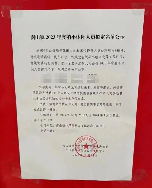 近日,网传广东佛山市三水区南山镇发布《2023年度躺平休闲人员拟定名单公示》,共有8人上榜“躺平者”名单。