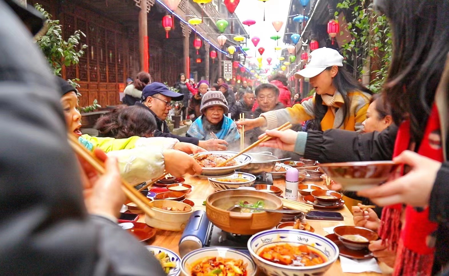 小长假期间,崇州传统景区街子古镇,依托当地特色美食,充分发扬古镇老巷传统民俗,于元旦节当天举办大型长街宴,传递当地居民美好生活祝福,分享新年喜悦。传统九大碗、白果鸡煲等美食勾勒出人间烟火,古风舞蹈、变脸、古琴演奏等节目烘托起热闹喜庆的节日气氛,吸引众多游客品尝特色美食,体验崇州韵味悠长的古镇和人间烟火。