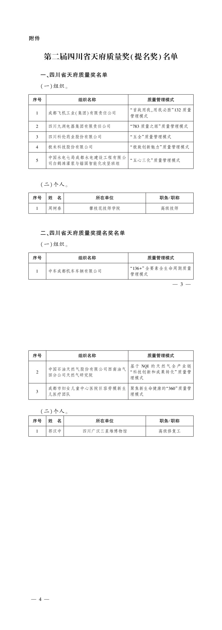 为深入学习贯彻习近平新时代中国特色社会主义思想,全面贯彻党的二十大精神和党中央、国务院关于质量强国建设的决策部署,认真落实省委十二届二次、三次、四次全会精神,深入推进质量强省建设,推动经济社会高质量发展,根据《四川省天府质量奖评选管理办法》,经评审,省政府决定授予成都飞机工业(集团)有限责任公司、四川九洲电器集团有限责任公司、四川科伦药业股份有限公司、极米科技股份有限公司、中国水电七局成都水电建设工程有限公司白鹤滩灌浆与锚固智能化攻坚班组5个组织和攀枝花技师学院周树春同志第二届四川省天府质量奖;授予中车成都机车车辆有限公司、中国石油天然气股份有限公司西南油气田分公司天然气研究院、成都市妇女儿童中心医院巨容劳模新生儿医疗团队3个组织和四川广汉三星堆博物馆郭汉中同志第二届四川省天府质量奖提名奖。