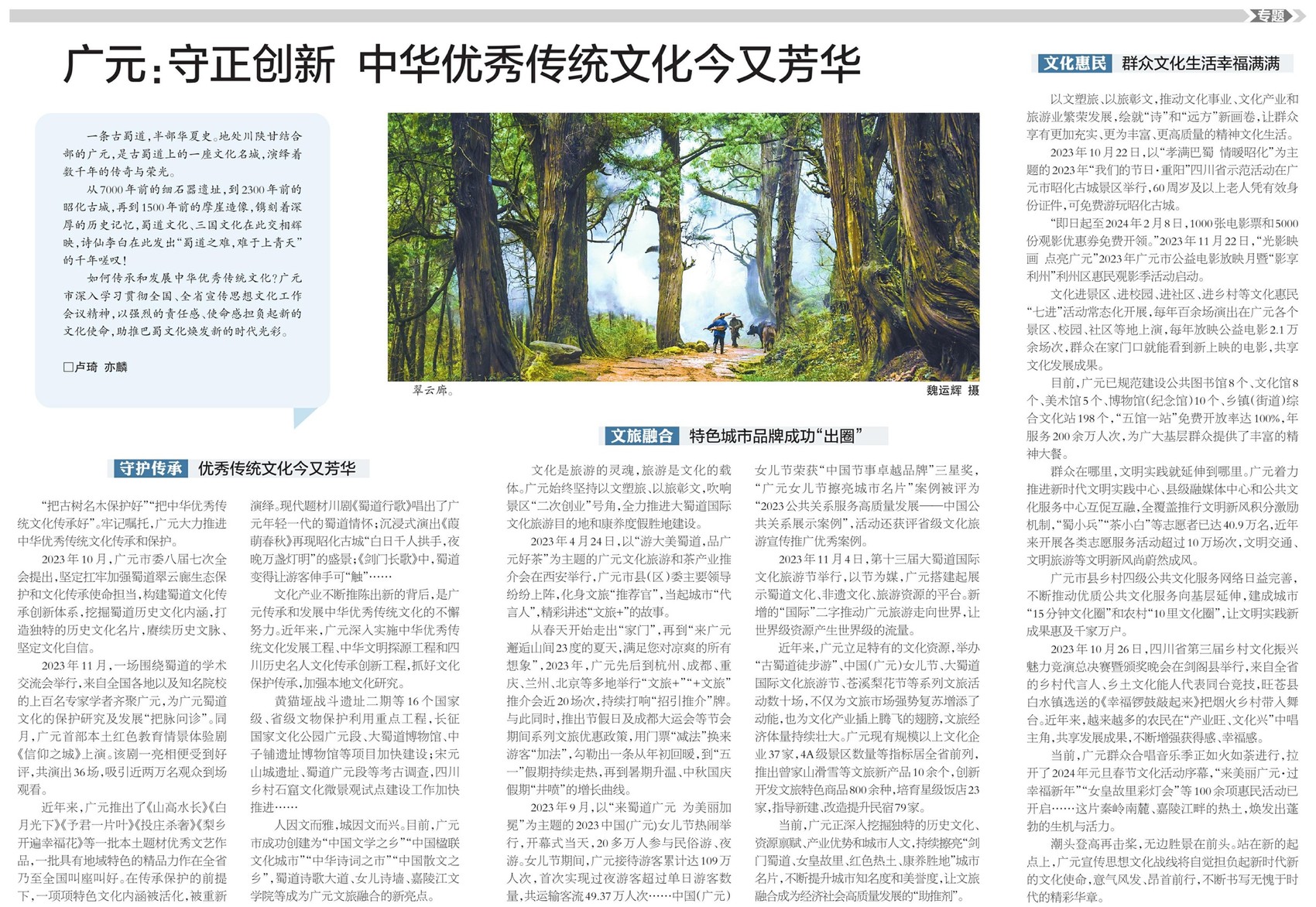 1月3日,《四川日报》3版关注广元传承和发展中华优秀传统文化。地处川陕甘结合部的广元,是古蜀道上的一座文化名城,演绎着数千年的传奇与荣光。如何传承和发展中华优秀传统文化?广元市深入学习贯彻全国、全省宣传思想文化工作会议精神,以强烈的责任感、使命感担负起新的文化使命,助推巴蜀文化焕发新的时代光彩。