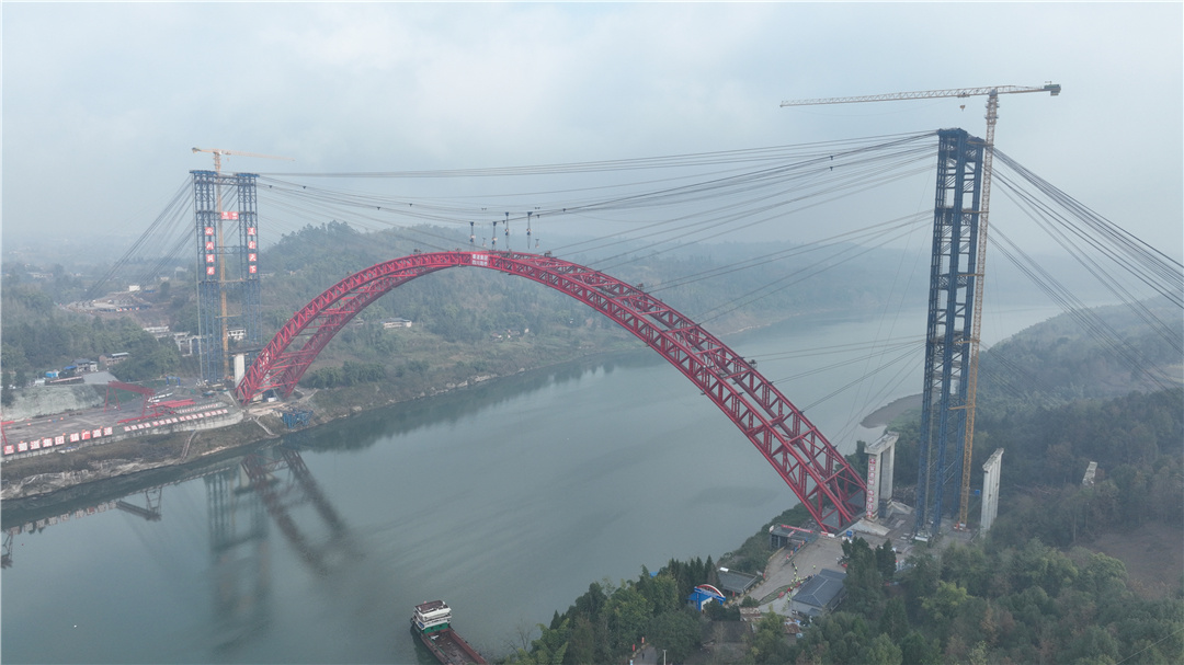 1月2日,随着最后一节钢管拱平稳就位并装配完成,镇巴(川陕界)至广安高速公路(以下简称“镇广高速”)控制性工程——白马渠江特大桥钢管拱实现合龙,为下阶段钢格梁安装、上部构造施工奠定坚实基础,也迎来项目2024年建设“开门红”。
