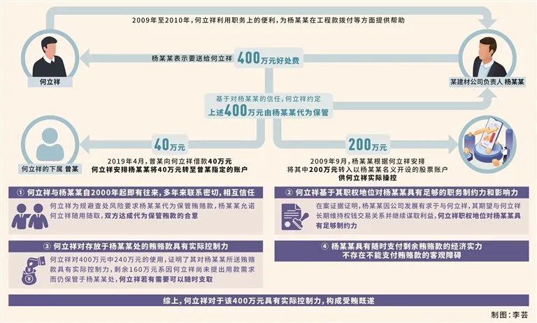 秦永春:何立祥收受杨某某400万元贿赂款的行为构成受贿既遂。该400万元虽由杨某某代为保管,其按照何立祥安排开设账户存入200万元供何立祥炒股,另有40万元按照何立祥的安排转账给其下属曾某使用,剩余160万元仍在杨某某处保管。该400万元中有240万元杨某某已按照何立祥的意愿使用、处分,成立受贿既遂没有争议。检察机关经审查,认为仍在杨某某处保管的160万元也应当认定为受贿既遂,理由如下:第一,行受贿双方关系密切,为规避查处风险,二人达成由杨某某代为保管贿赂款的合意。何立祥与杨某某自2000年起即有往来,多年来联系密切,相互信任。何立祥为杨某某承揽工程项目提供帮助,杨某某则提出送予其400万元,何立祥表示同意,基于对杨某某的信任并为规避查处风险要求杨某某代为保管贿赂款,杨某某允诺何立祥可以随用随取,双方达成代为保管贿款的合意。第二,何立祥基于其职权地位对杨某某具有足够的职务制约力和影响力。在案证据证明,杨某某因公司业务发展有求于何立祥,其期望与何立祥长期维持权钱交易关系并继续谋取利益。何立祥职权地位对杨某某的制约关系,足以保证杨某某成为“合格保管人”。第三,何立祥对存放于杨某某处的贿赂款具有实际控制力。根据杨某某证言,其为了对何立祥表示感谢,并期望继续谋取利益,送给何立祥400万元,虽由其代为保管,但何立祥可以随用随取,双方对此心知肚明。前述240万元的使用,证明了何立祥对杨某某所送贿赂款具有实际控制力,此外,逢年过节期间杨某某还会送给何立祥礼品礼金,继续维持关系。由此可见,剩余160万元系因何立祥尚未提出用款需求而仍保管于杨某某处,何立祥若有需要可以随时支取,可以认定其对剩余贿赂款具有实际控制力。第四,在案证据显示,杨某某具有随时支付剩余贿赂款的经济实力,不存在不能支付贿赂款的客观障碍。
