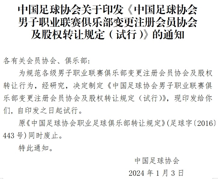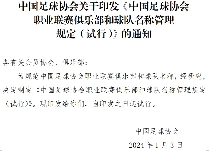 1月3日,中国足协通过其官方网站一次性发布了三份职业联赛政策文件,内容包括开放球队冠名、增加外援出场名额以及允许俱乐部异地搬迁等方面,备受各界关注。
