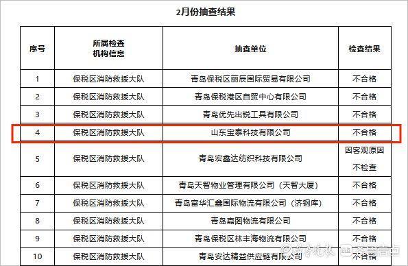 2023年3月6日,青岛市消防救援支队的微信公众号上发布的《2023年“双随机、一公开”2月份消防监督抽查结果》显示,2023年2月,青岛保税区消防救援大队对宝泰科技进行的消防监督抽查结果为不合格。