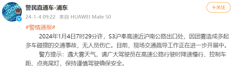 上海浦东警方今天9时22分发布警情通报:2024年1月4日7时29分许,S3沪奉高速近沪南公路出口处,因团雾造成多起多车碰擦的交通事故,无人员伤亡。目前,现场交通疏导工作正在进一步开展中。