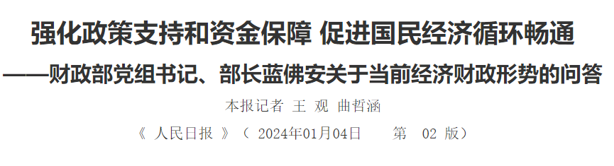 1月4日,《人民日报》发布了《强化政策支持和资金保障 促进国民经济循环畅通——财政部党组书记、部长蓝佛安关于当前经济财政形势的问答》,内容如下: