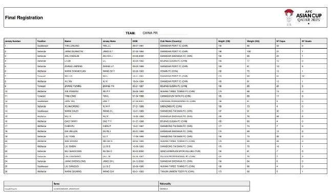1月4日,亚足联在其官方网站更新了中国男足参加此次卡塔尔亚洲杯的球员名单。在这份26人名单当中,武磊、韦世豪等国内球员无悬念入选,而归化球员李可则落选,来自成都蓉城的蹇韬成为了四川球员在本届亚洲杯上的“独苗”。