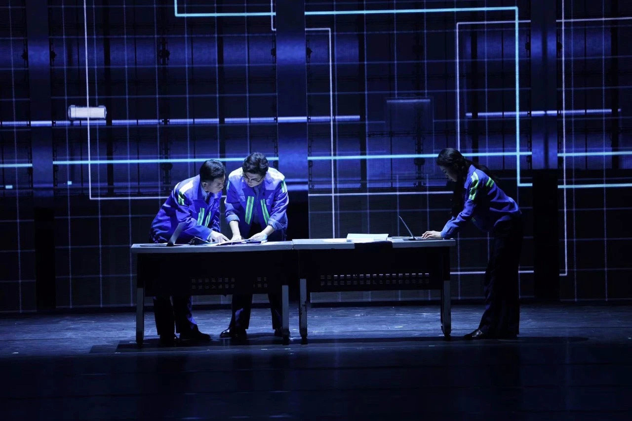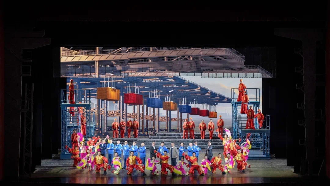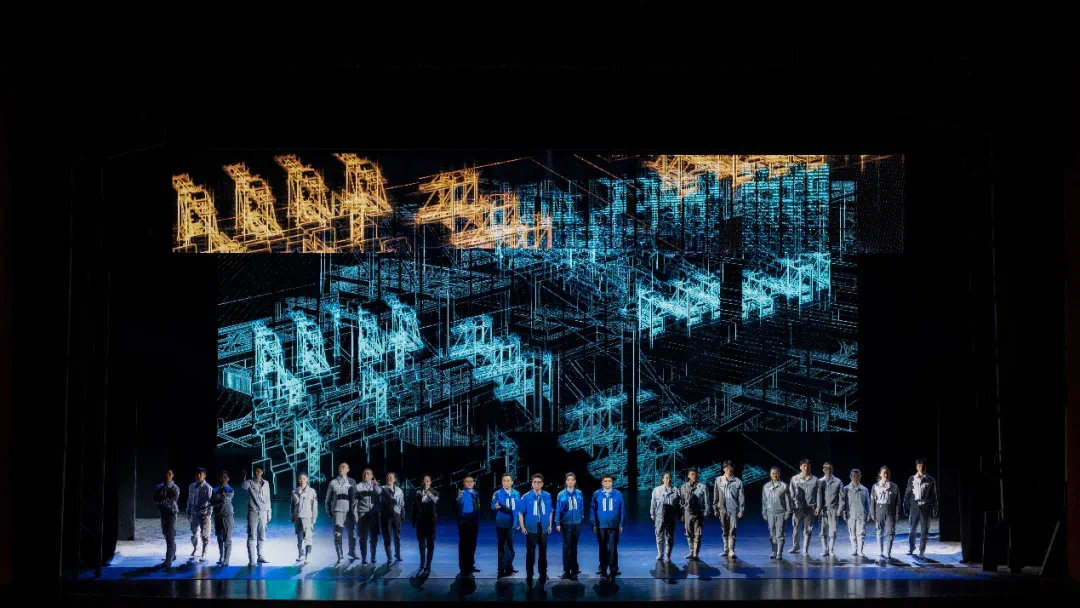 连钢团队测算验证场景、集装箱三维立体呈现,《东方大港》充满现代工业科技感的舞台也让观众眼前一亮。在舞美视觉呈现上,该剧打破观众对于传统京剧的刻板印象,除了传统的一桌二椅,《东方大港》利用多媒体影像加以辅助,更直观形象地表现当代科技的发展,既保持京剧的写意简约的特性,又能体现出科技感、智能化的新时代海港风貌。