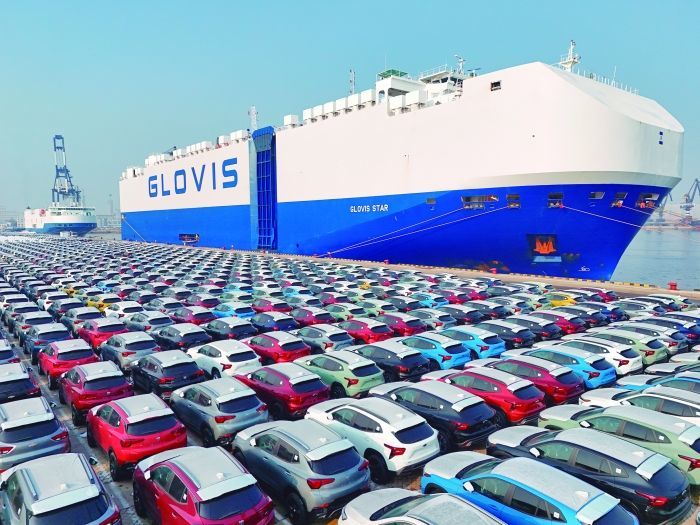 新年伊始,各大港口货轮进出,各作业码头运输车辆穿梭如织,货物进出繁忙。图为1月2日,汽车在山东港口烟台港集结等待装船出口。 新华社图