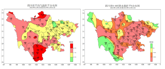 2023年12月四川省平均气温距平(左)和平均降水量距平百分率(右)分布图