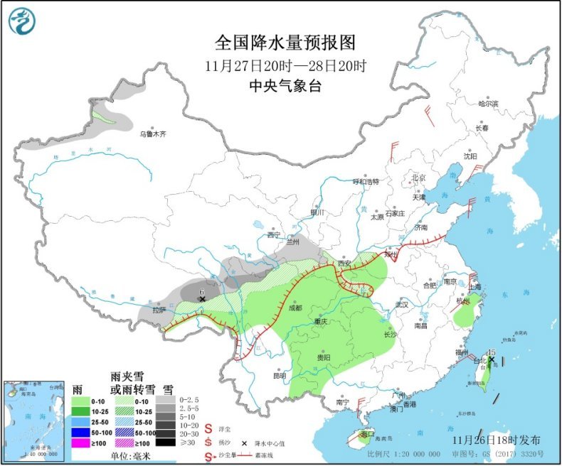 11月27日20时至28日20时,新疆西部、西藏东部、青海南部、甘肃南部、陕西南部等地部分地区有小雪或雨夹雪,其中,西藏东南部、青海南部、川西高原北部局地有中到大雪(5~6毫米)。西北地区东南部、西南地区东部、云南东部、江汉西部、湖南大部、浙江大部、广西西部、海南岛东部、台湾岛东部等地部分地区有小雨,其中,台湾岛东北部局地有中到大雨(25~45毫米)。内蒙古中部、辽宁东部、山东半岛、江苏东部、浙江大部、广西东南部等地部分地区有4~6级风。
