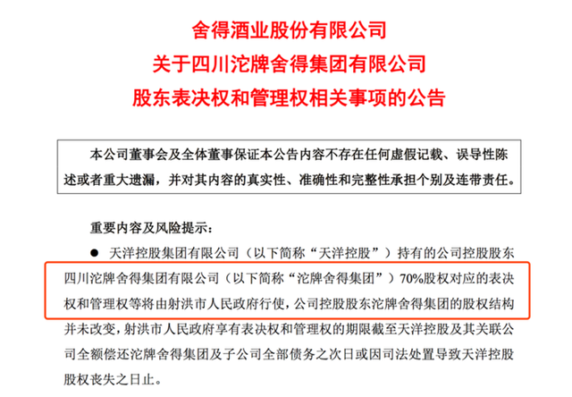 11月26日晚间,舍得酒业股份有限公司发布公告称,天洋控股集团有限公司持有的公司控股股东四川沱牌舍得集团有限公司70%股权对应的表决权和管理权等将由射洪市人民政府行使。