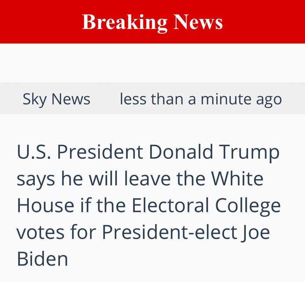 外媒:特朗普称如果选举人团投票给拜登,他将离开白宫