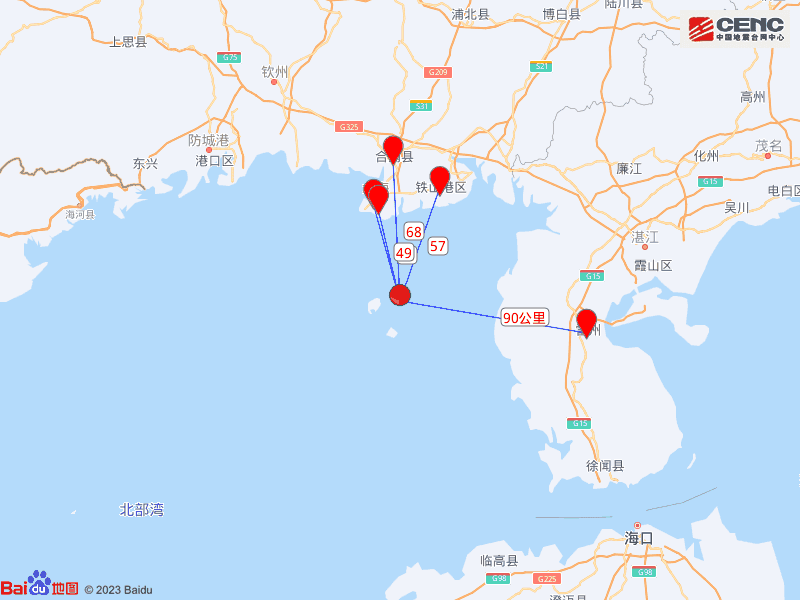 周边县城:震中距银海区46公里、距海城区49公里、距铁山港区57公里、距合浦县68公里、距广东雷州市90公里,距北海市50公里,距海口市163公里。