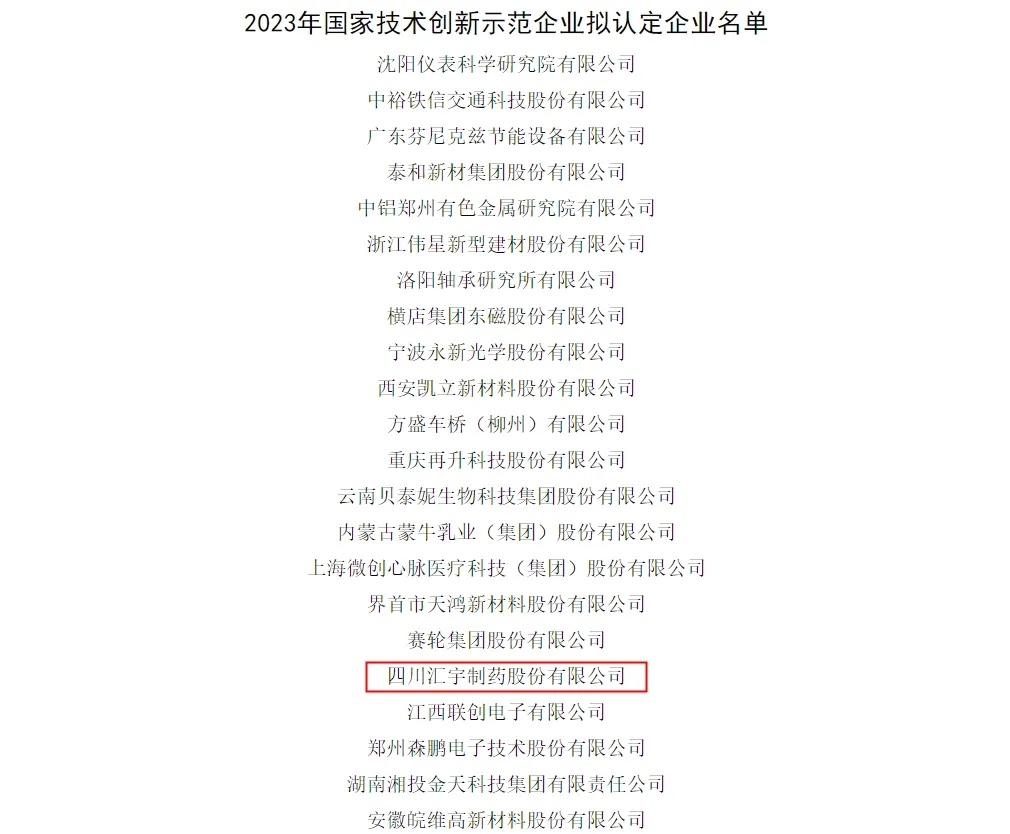 2024年1月2日,工业和信息化部官网发布《2023年国家技术创新示范企业拟认定名单公示》。其中,四川汇宇制药股份有限公司成为拟认定的68家国家技术创新示范企业之一。这是该公司在获评第30批国家企业技术中心后,又一项创新相关的国家级荣誉。