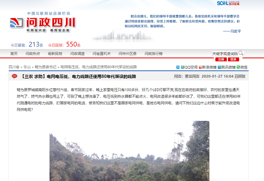 2020年1月27日,有网友在问政四川平台上反映犍为县罗城镇南阳乡红蓉村六组还在使用80年代刚通电时的电力线路,电压过低,导致电灯供电都成问题,希望有关部门对电网供电进行升级改造。