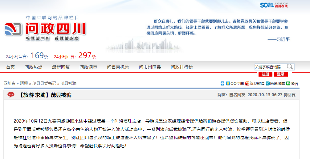 10月以来,多位游客在问政四川上投诉阿坝州茂县有珠宝店设置“富二代”骗局,诱导游客进行高额低质消费,引发关注。