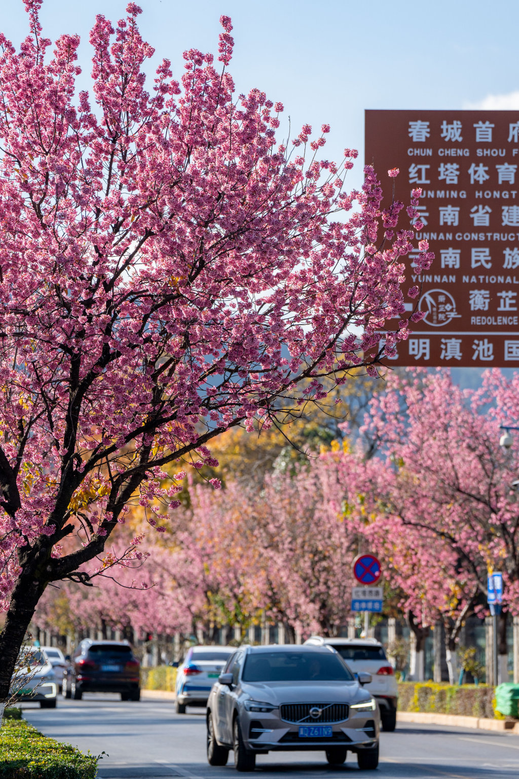 近日,云南省昆明市阳光明媚,气候宜人。市区的冬樱花绚烂绽放,吸引众多市民和游客驻足观赏,拍照留念。