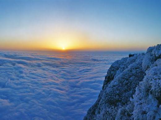 近日,峨眉山金顶雪后初晴,到处一片粉妆玉砌。林海被绒花覆盖,金顶的轮廓被霞光勾勒,雪色昭昭,衬着银光闪耀。远处的贡嘎雪、 瓦屋山、大瓦山等众多山峰也白雪皑皑,若隐若现的延绵在无边的云海之中。青山遥遥,雪雾细细,雪后的峨眉山,美出新高度!