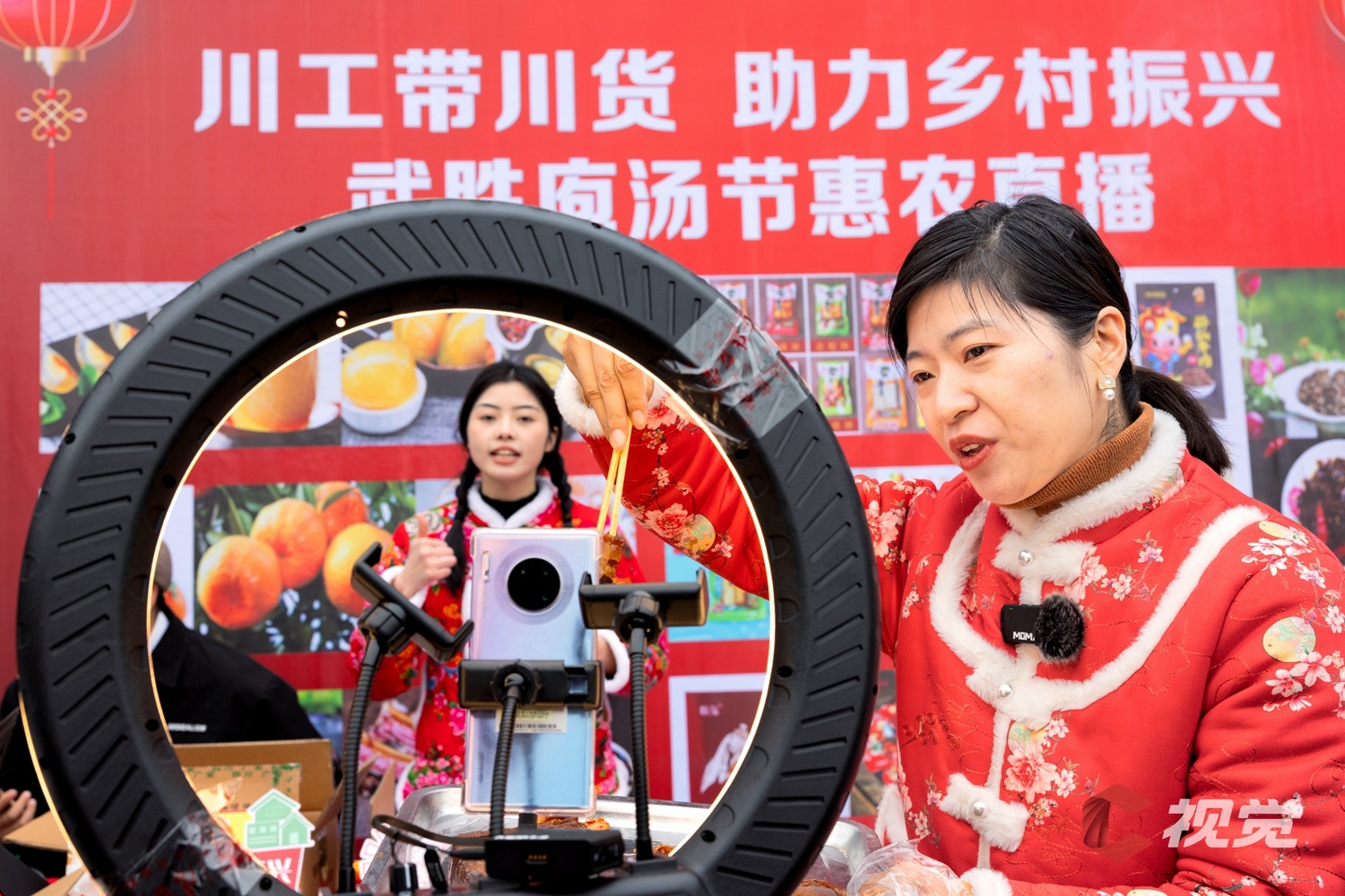 活动现场还设有武胜庖汤节惠农直播,主播在镜头面前热情推介着武胜特色农产品。