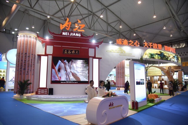 走进内江馆,“成渝之心 大千故里 甜城内江”的标语格外醒目。以大千故里的书香文化为创意点,以展开的画卷造型为主形象,结合内江标志古建筑轮廓,和谐且美观。展馆内部,将内江新农村元素和展柜结合,展示形式丰富,产品陈列多样。接待处右侧设置小景观,展示甜橙、夏布、甘蔗等元素。