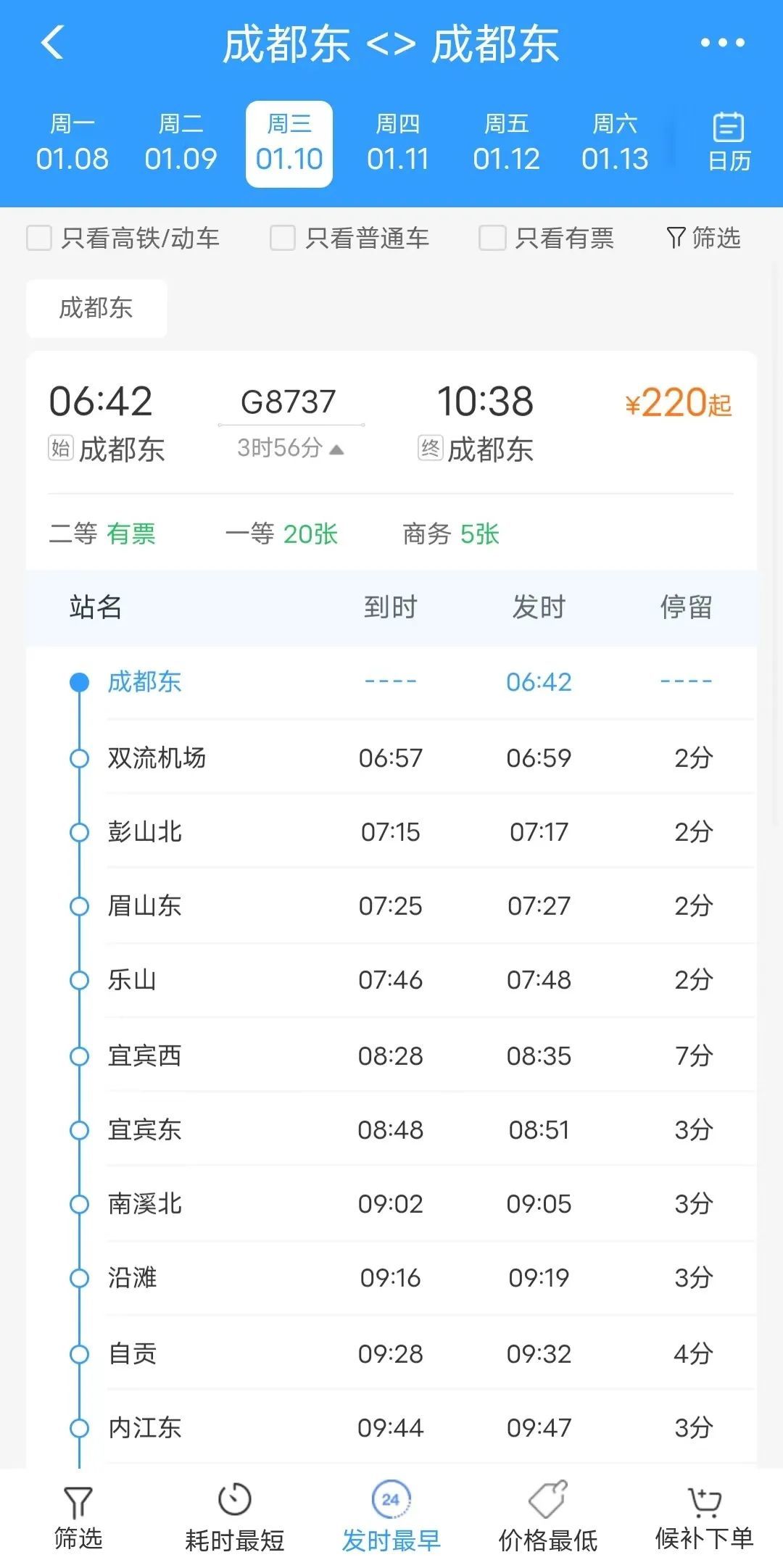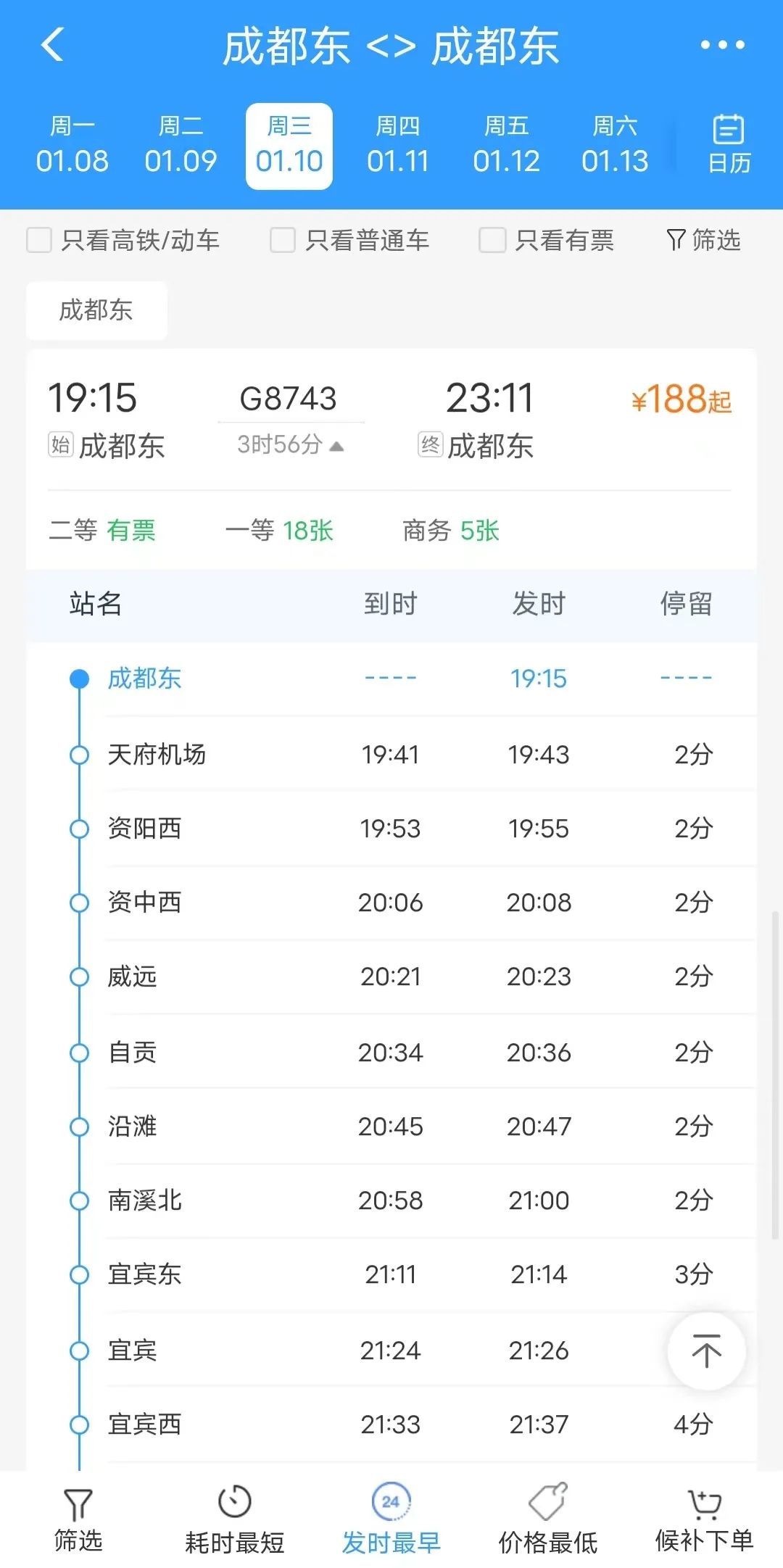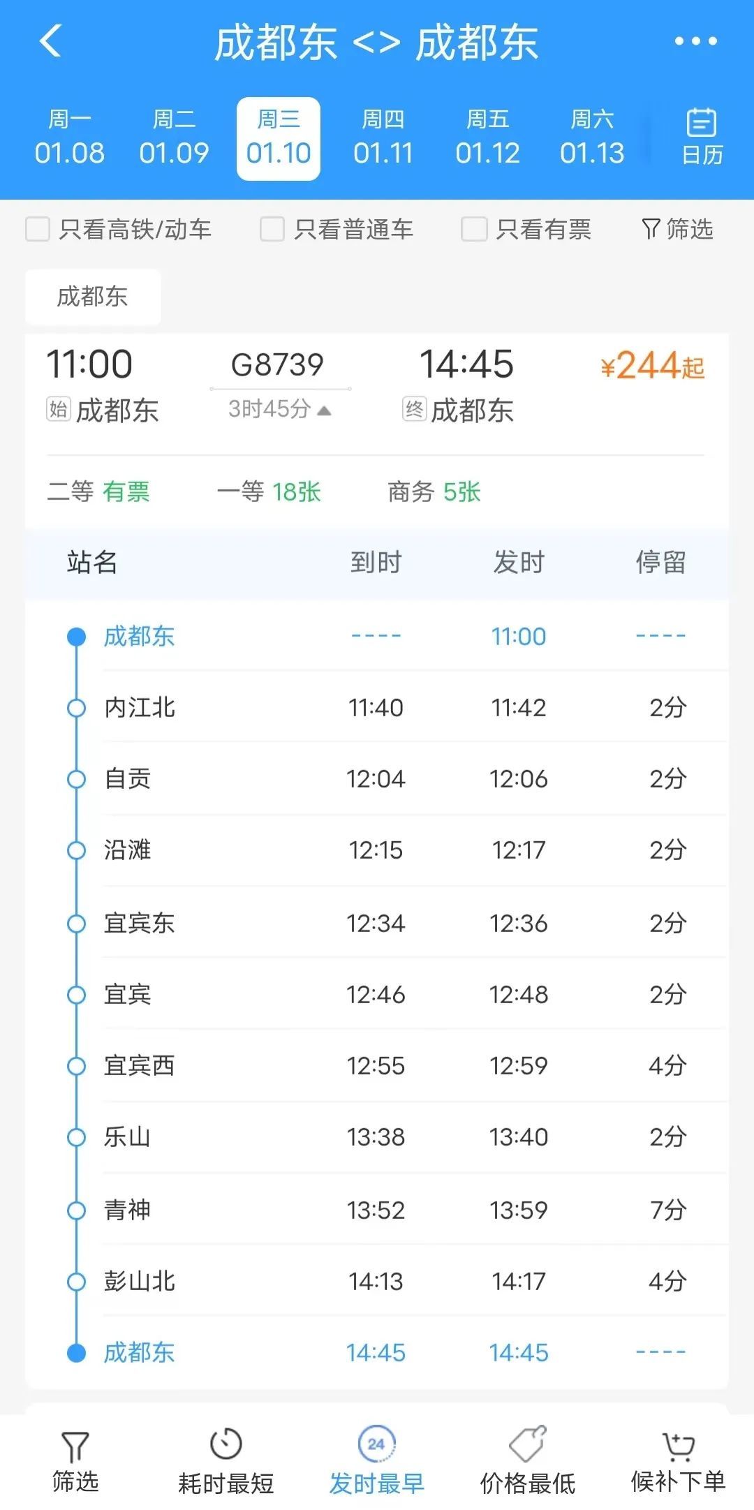 此外,调整经由、新增成自宜高铁管内动车组列车11对,打造自贡、宜宾一站直达精品动车产品,满足旅客出行需求。其中,成都东至宜宾直达动车组列车运行73分钟、成都东至自贡直达动车组列车运行51分钟。