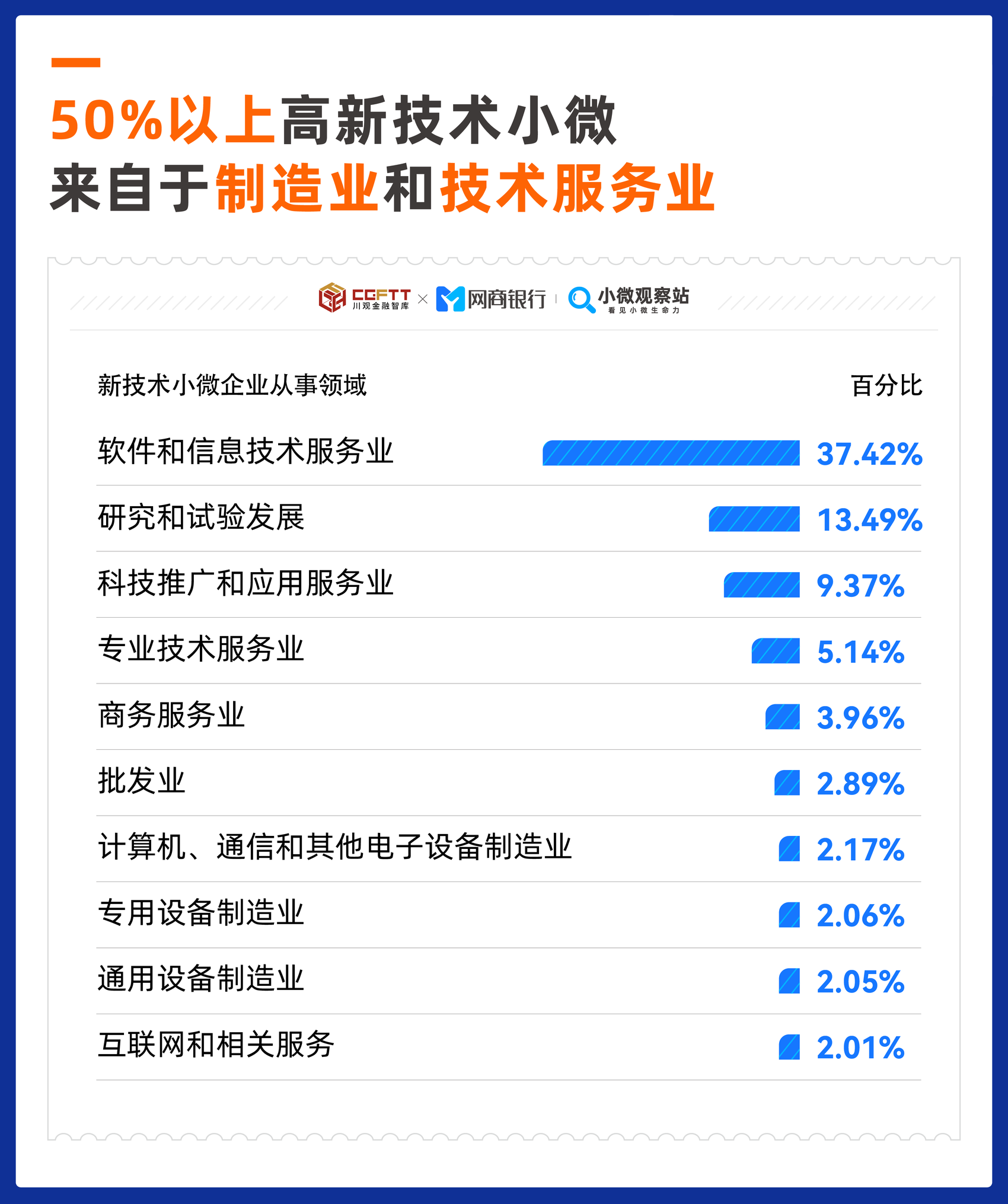 网商银行小微观察站数据显示,四川省高新技术小微企业中,研究和试验发展标签的企业占比达到13.49%。叠加另三个标签领域:专用设备制造业 、化学原料和化学制品制造业、汽车制造业,总占比已超过15%。