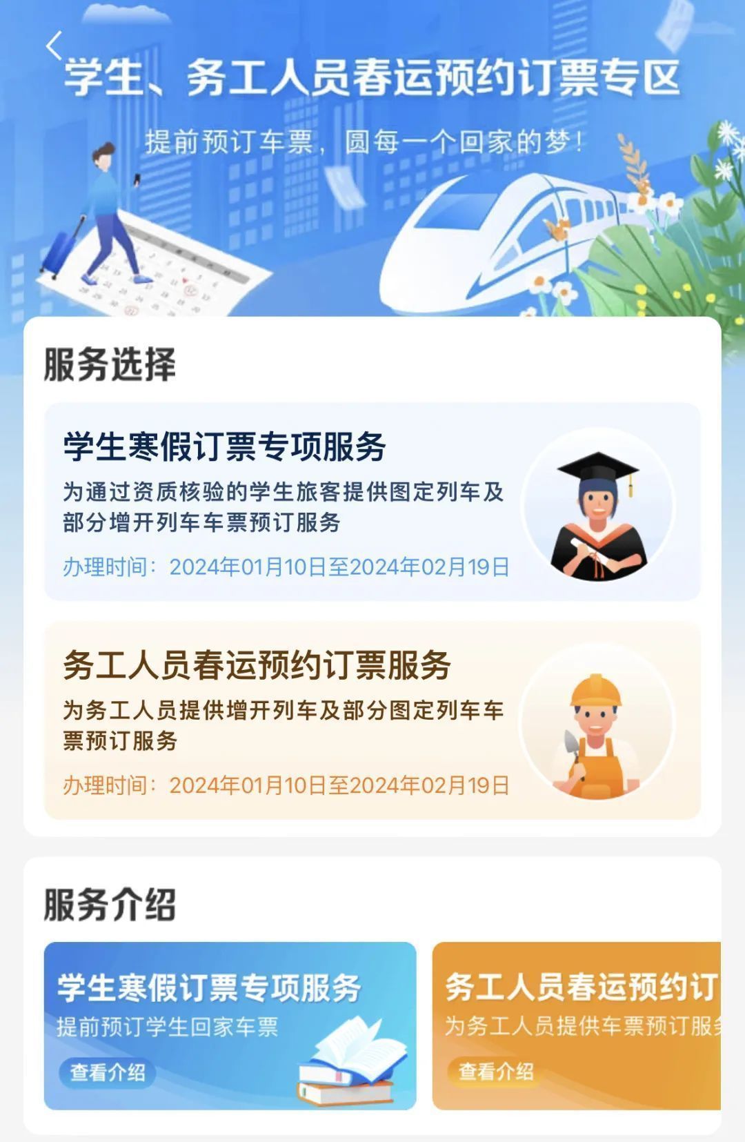 铁路12306科创中心相关负责人介绍,为认真贯彻落实党中央国务院关于做好2024年元旦春节期间有关工作的要求,保障学生、务工人员等重点群体春运出行,铁路12306创新服务举措,为学生、务工人员推出了售票服务专区。自1月10日起,符合条件的学生旅客(已通过学生优惠资质核验且有剩余优惠乘车次数)可通过“学生寒假订票专项服务”专区预约购买春运期间(1月26日至3月5日)火车票,每名旅客最多可同时提交6个预约订单,每个订单可添加1个乘车日期的20个“车次+席别”的组合,可选席别为学生优惠票适用的硬座、硬卧、二等座。已通过实名制核验的务工人员可通过“务工人员春运预约订票服务”专区预约购买春运期间火车票,每名旅客可同时提交6个预约订单,每个订单可选择“时间+车次+席别”的1个组合。